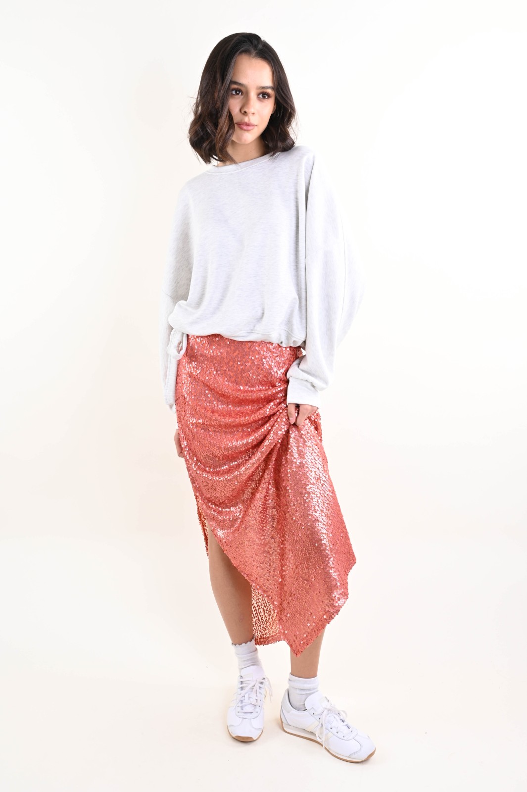 Gonna lunga donna dal forte impatto visivo, caratterizzata da una superficie interamente decorata con paillettes che dona luminosità e movimento al capo. La linea dritta e fluida valorizza la silhouette, creando un equilibrio perfetto tra femminilità e carattere contemporaneo.