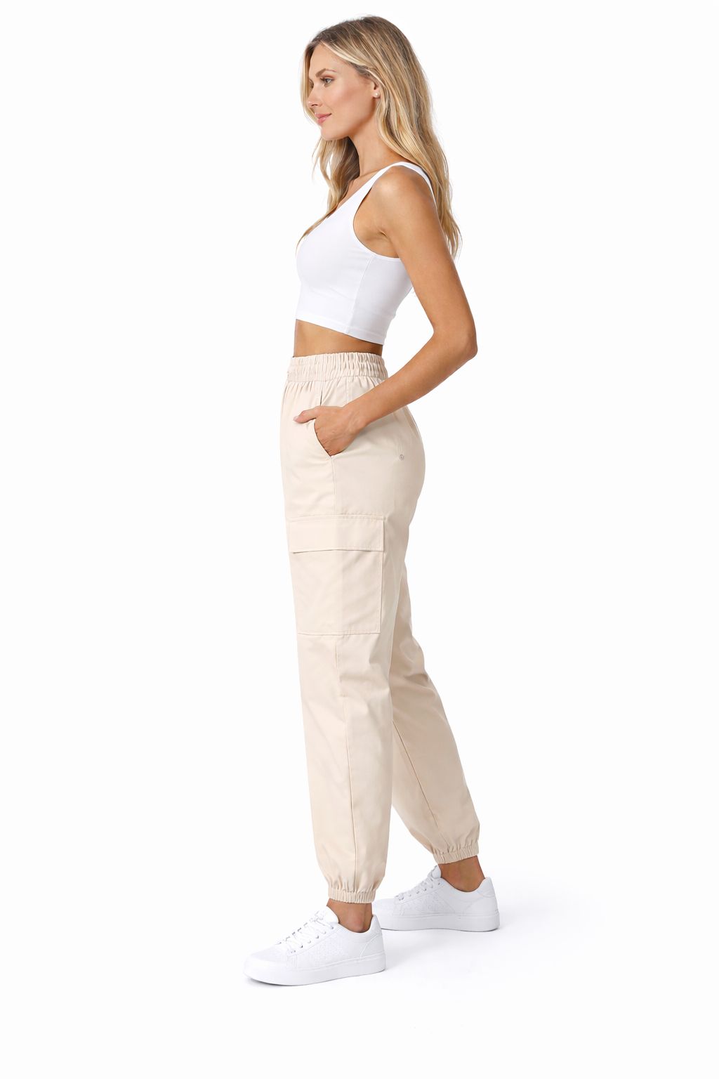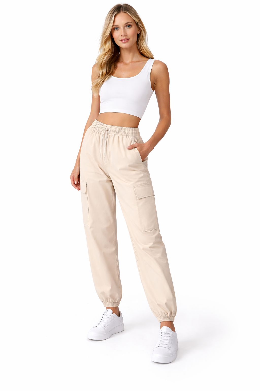 Pantaloni cargo jogger da donna dal design contemporaneo e funzionale, perfetti per creare look casual e dinamici. Il modello presenta vita elasticizzata con coulisse regolabile che garantisce comfort e vestibilità adattabile. Le ampie tasche applicate sui lati aggiungono un dettaglio utilitario di tendenza, ideale per uno stile urbano e moderno.