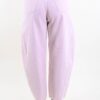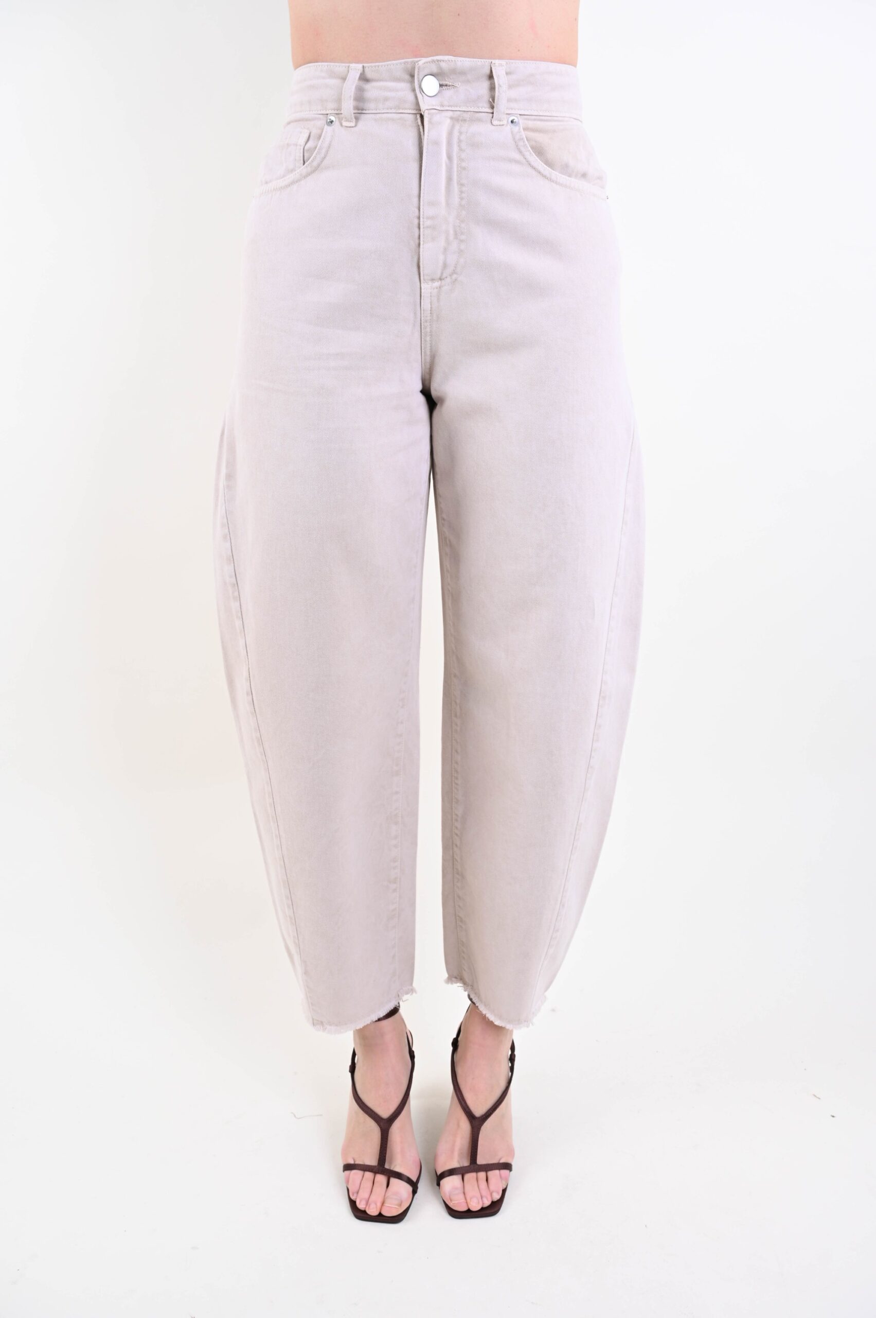 Pantaloni balloon da donna con vita alta e costruzione strutturata, pensati per offrire una vestibilità moderna e valorizzante. La gamba ampia si sviluppa in modo armonioso lungo la silhouette per poi restringersi leggermente sul fondo, creando il tipico volume del modello balloon.