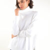 Maglia donna con collo alto a coste che avvolge delicatamente il collo offrendo calore e stile. Le spalle raglan sono impreziosite da un sottile motivo a mini treccia, un dettaglio raffinato che valorizza la linea pulita del capo. Il fondo e i polsini a coste donano struttura e una vestibilità impeccabile.