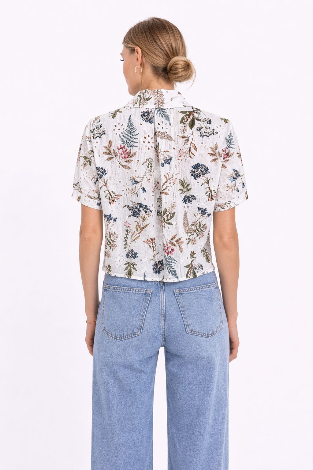 Camicia in sangallo con stampa floreale dal fascino romantico e contemporaneo, pensata per valorizzare la silhouette con un tocco leggero e femminile. Il tessuto sangallo aggiunge texture e raffinatezza, rendendo il capo ideale per la stagione più calda.