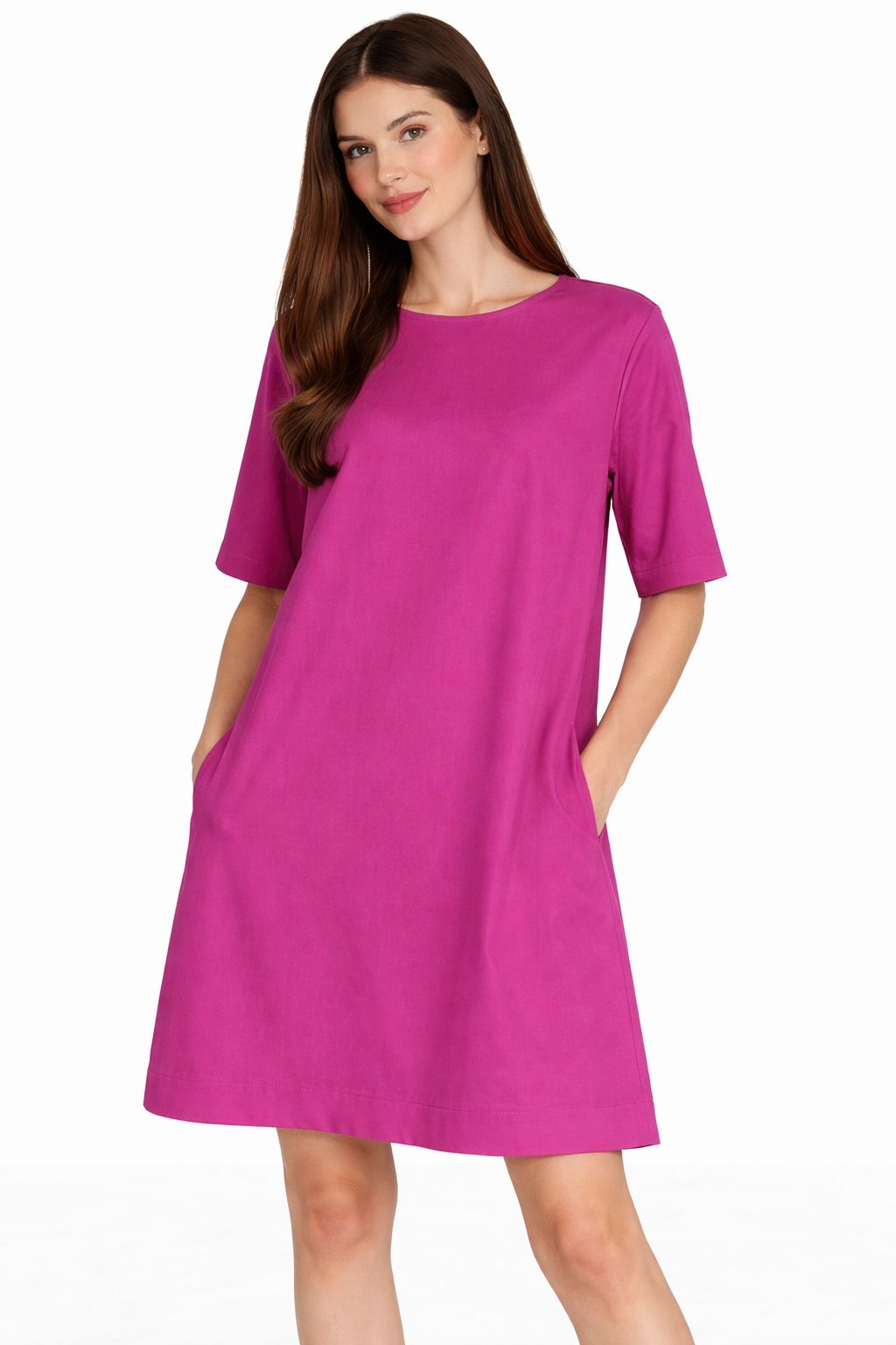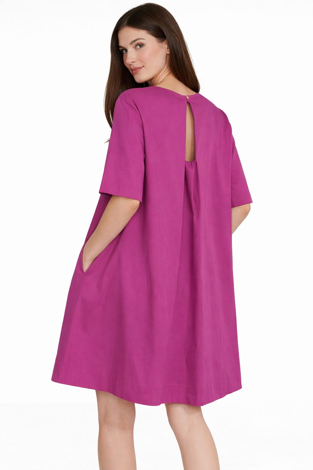 Abito a maniche corte in popeline con scollatura a goccia sul retro e bottoncino a chiusura, un capo fresco e versatile ideale per la stagione primavera estate. La linea pulita e la vestibilità confortevole lo rendono perfetto per accompagnare ogni momento della giornata, mantenendo uno stile semplice ma curato.