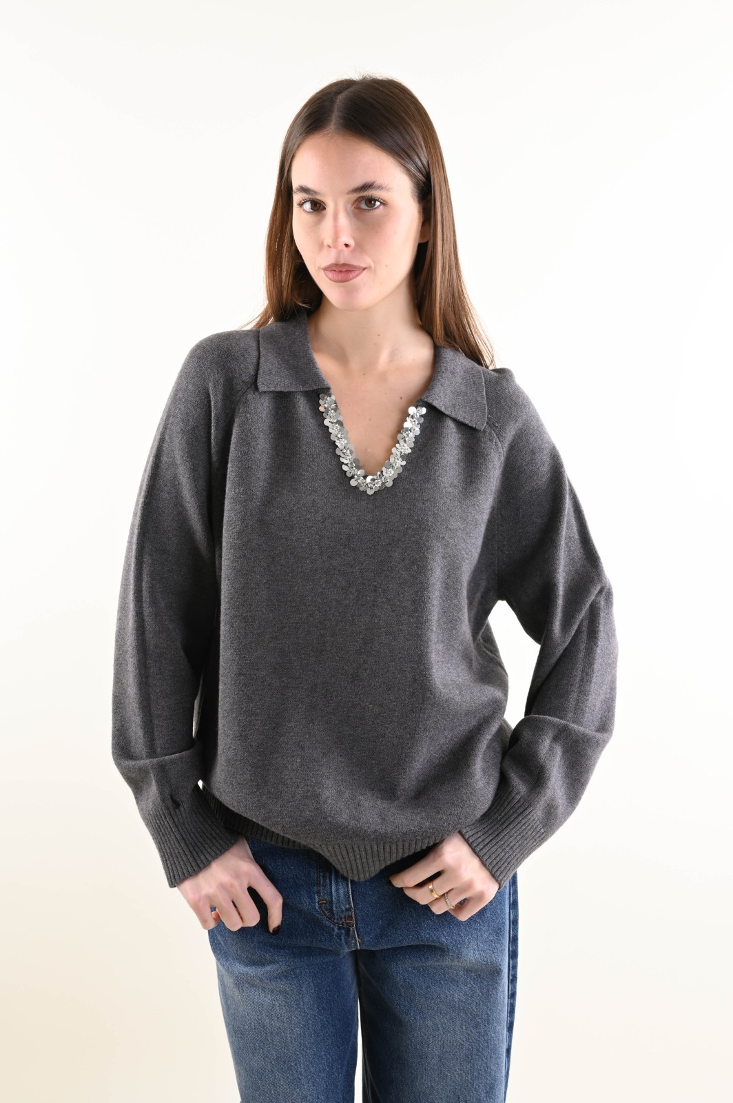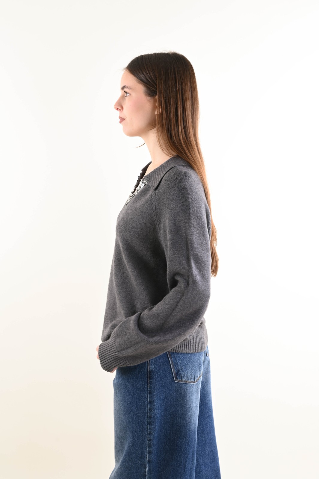 Maglia donna con colletto e scollo impreziosito da applicazioni gioiello, un modello elegante e femminile perfetto per boutique che desiderano proporre maglieria raffinata.