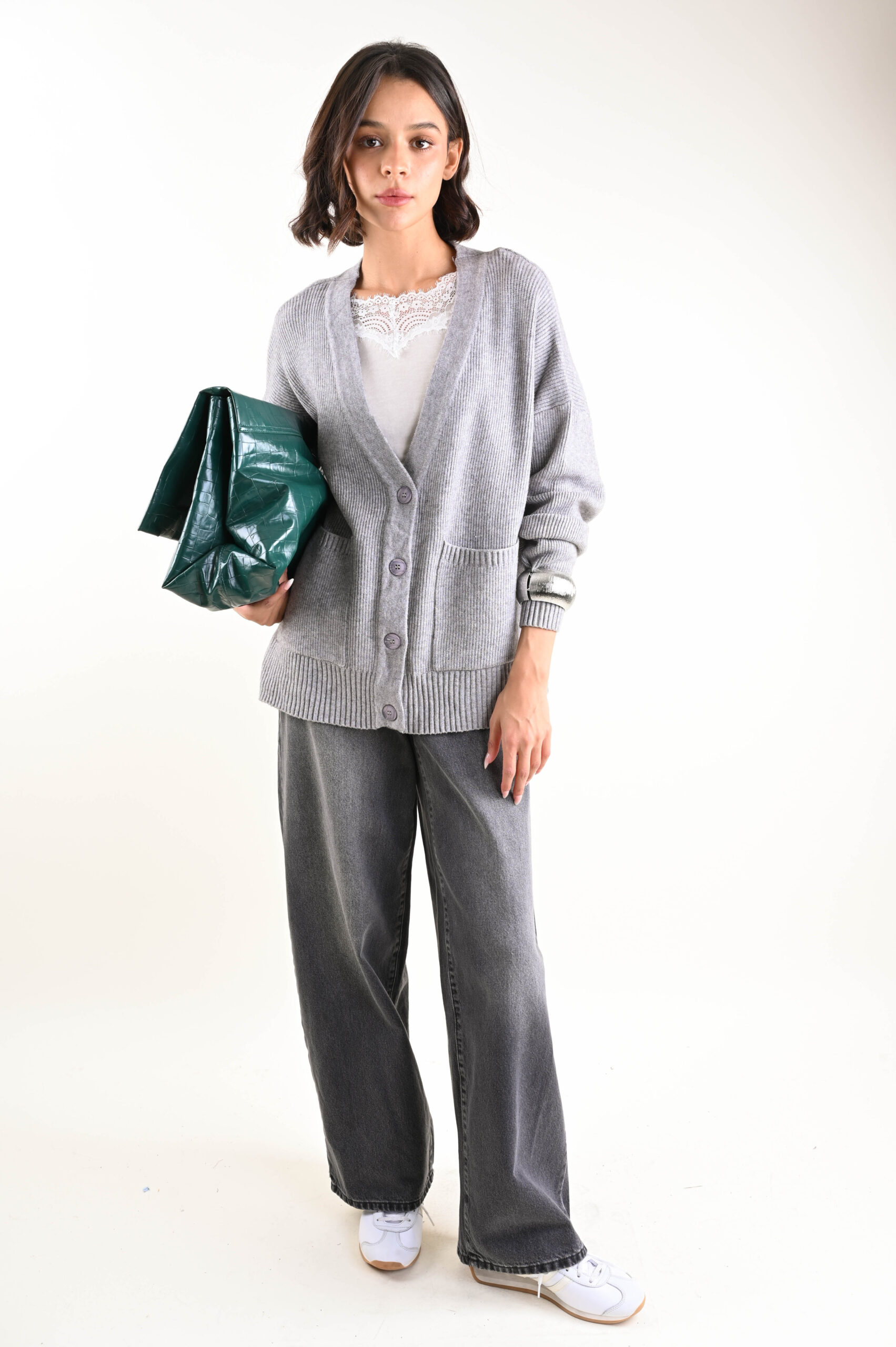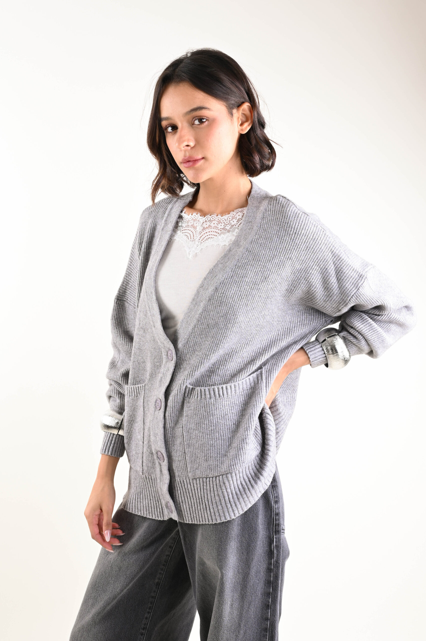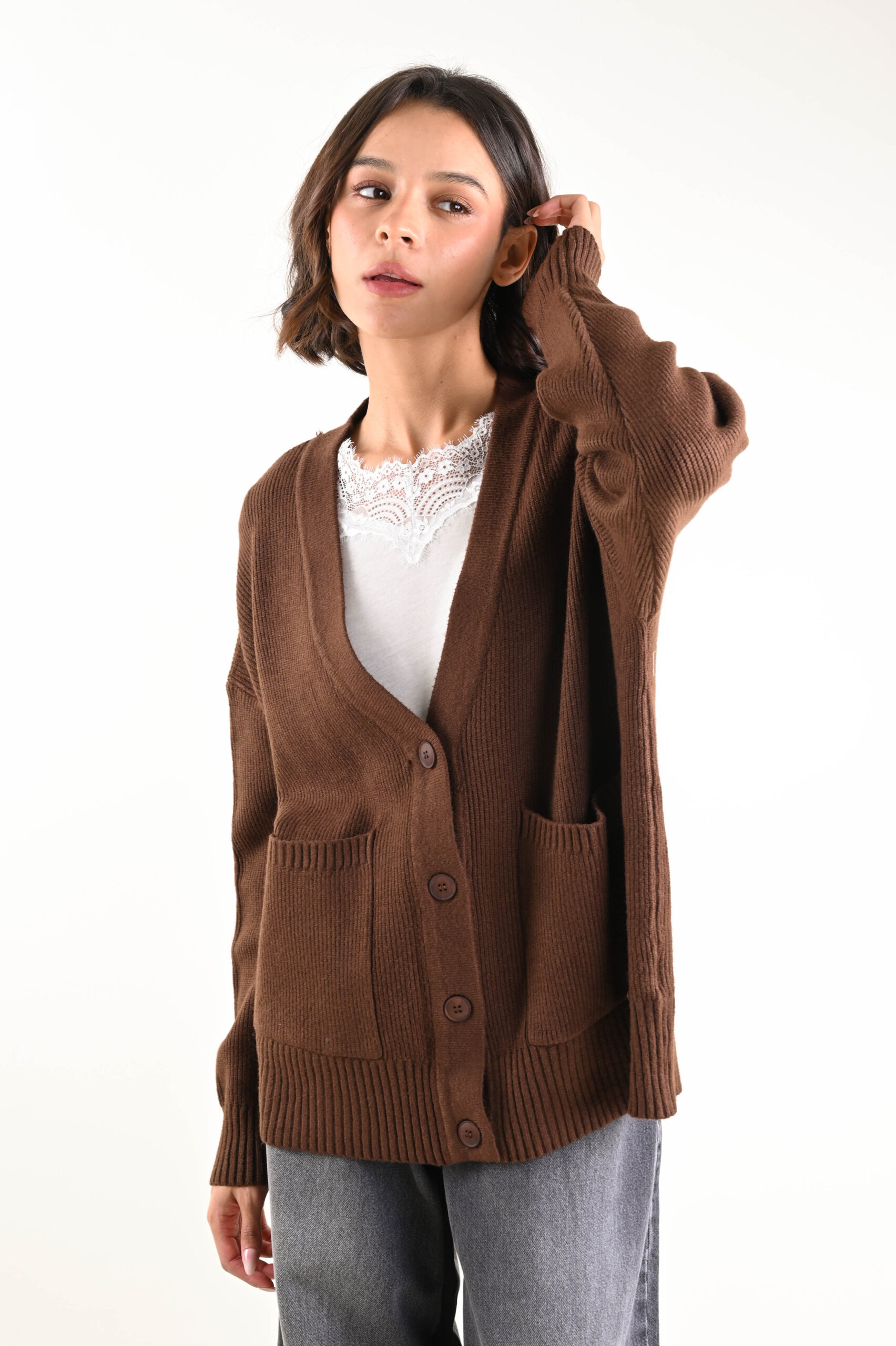 Cardigan in maglia a coste con scollo a V profondo e chiusura frontale con bottoni. Il modello presenta linea morbida, spalle scese e due taschini applicati sul davanti che aggiungono un tocco casual e funzionale. Realizzato in un filato caldo e confortevole, è perfetto da indossare sopra top e camicie per creare look versatili e contemporanei. Un capo essenziale che interpreta alla perfezione l’equilibrio tra praticità e femminilità tipico di Myastreet.
