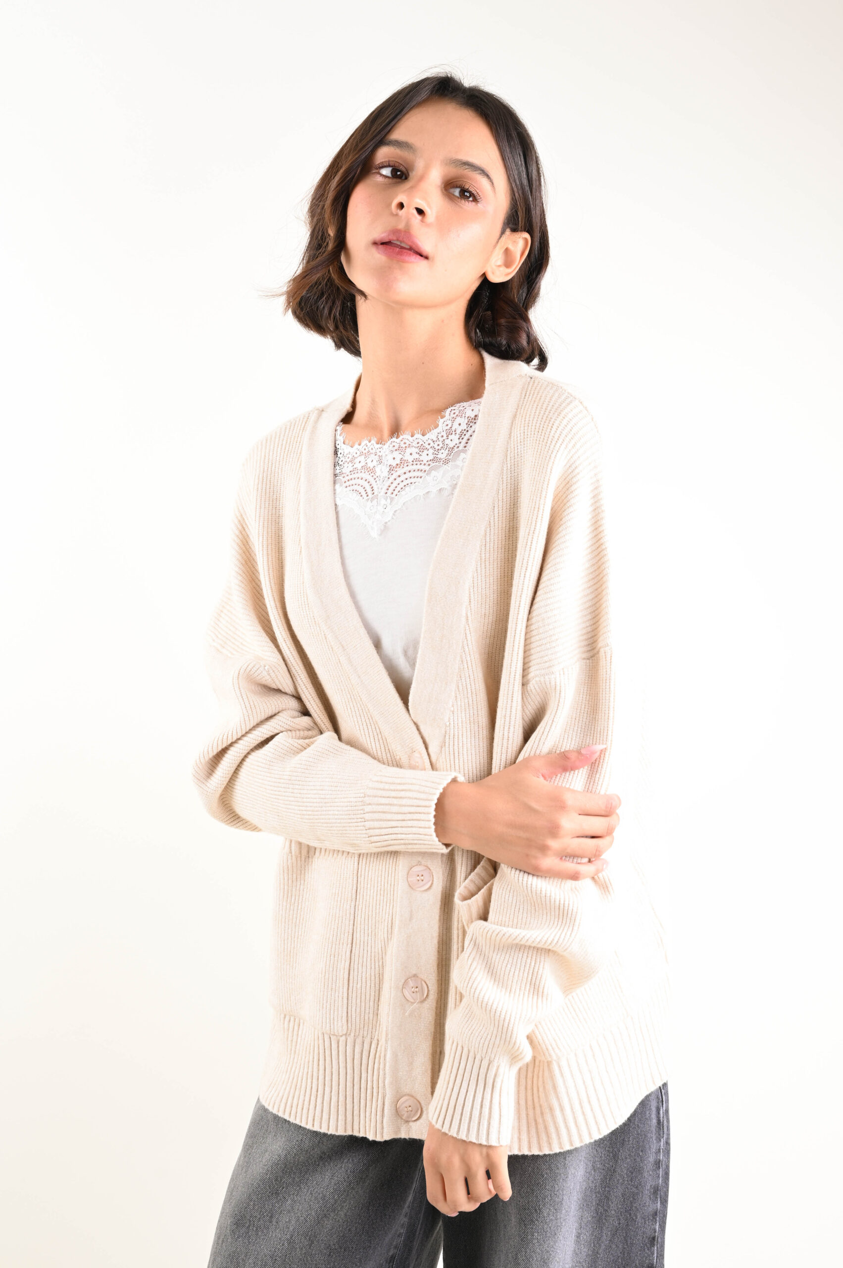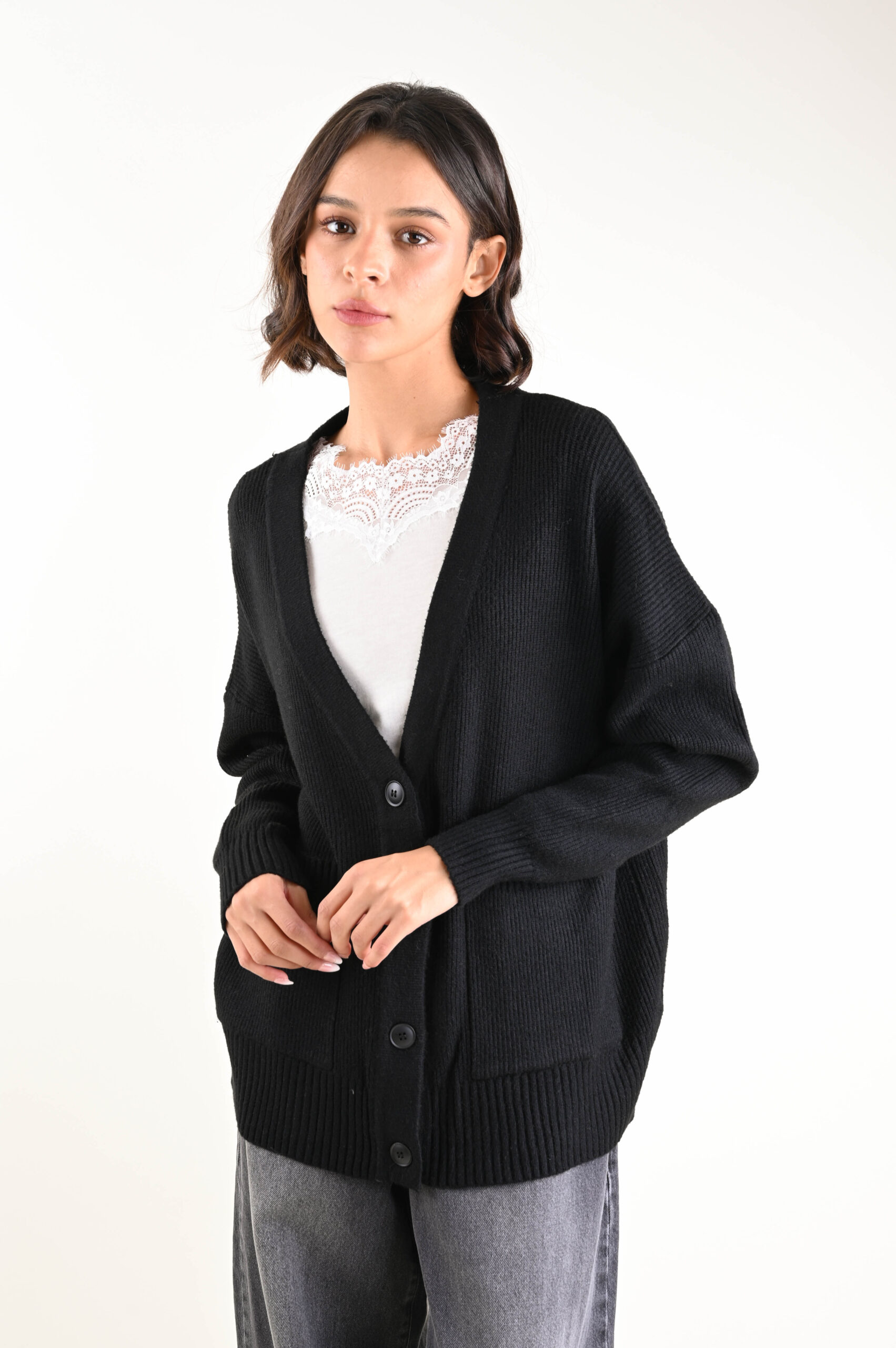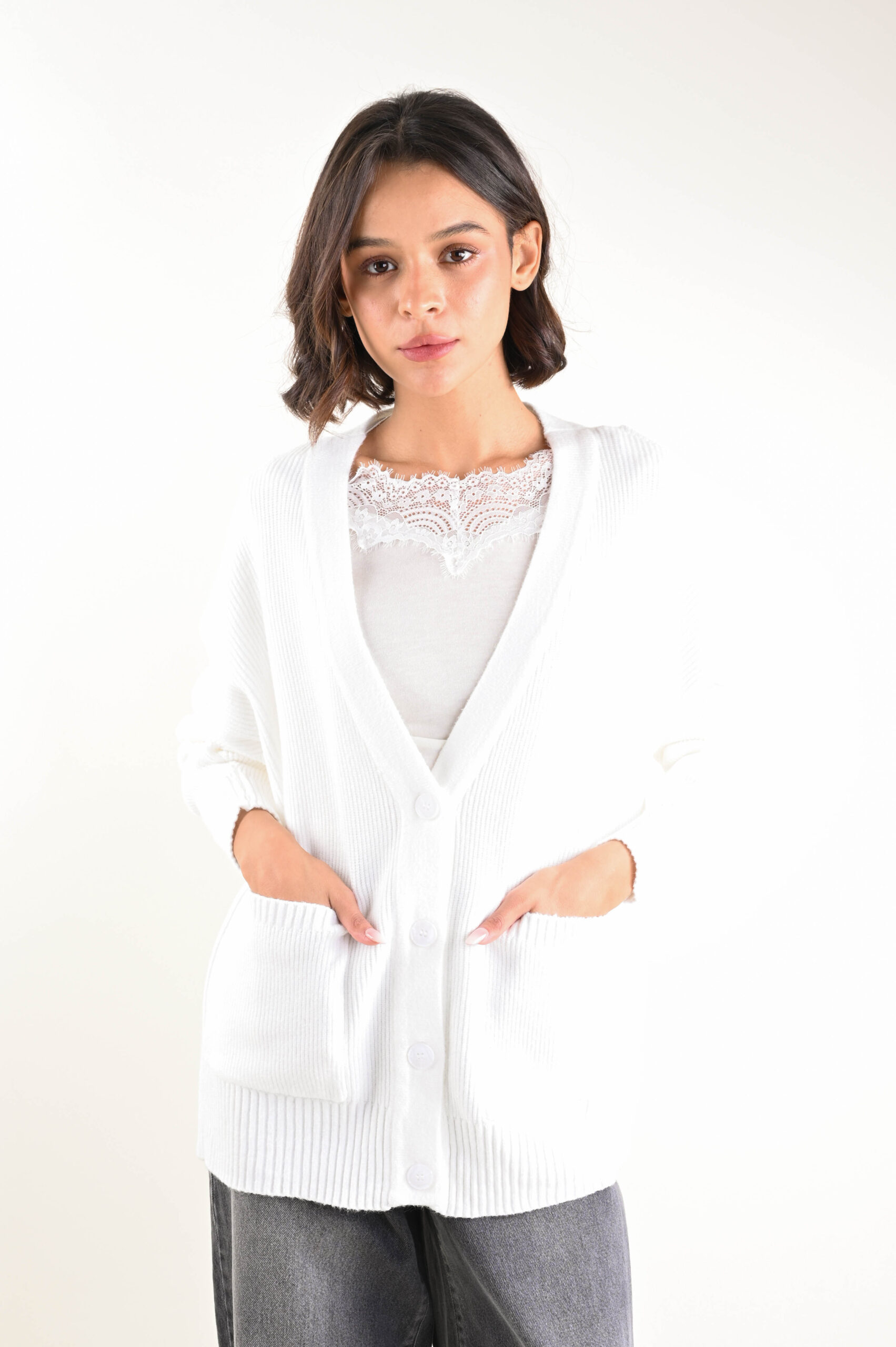Cardigan in maglia a coste con scollo a V profondo e chiusura frontale con bottoni. Il modello presenta linea morbida, spalle scese e due taschini applicati sul davanti che aggiungono un tocco casual e funzionale. Realizzato in un filato caldo e confortevole, è perfetto da indossare sopra top e camicie per creare look versatili e contemporanei. Un capo essenziale che interpreta alla perfezione l’equilibrio tra praticità e femminilità tipico di Myastreet.