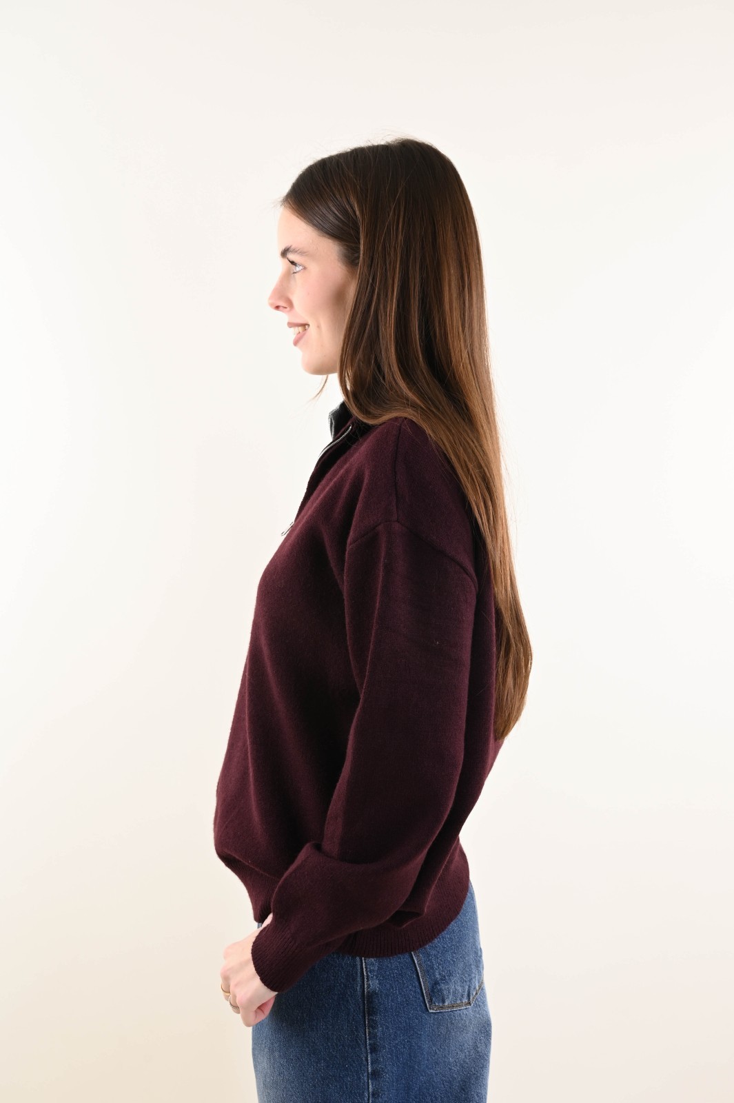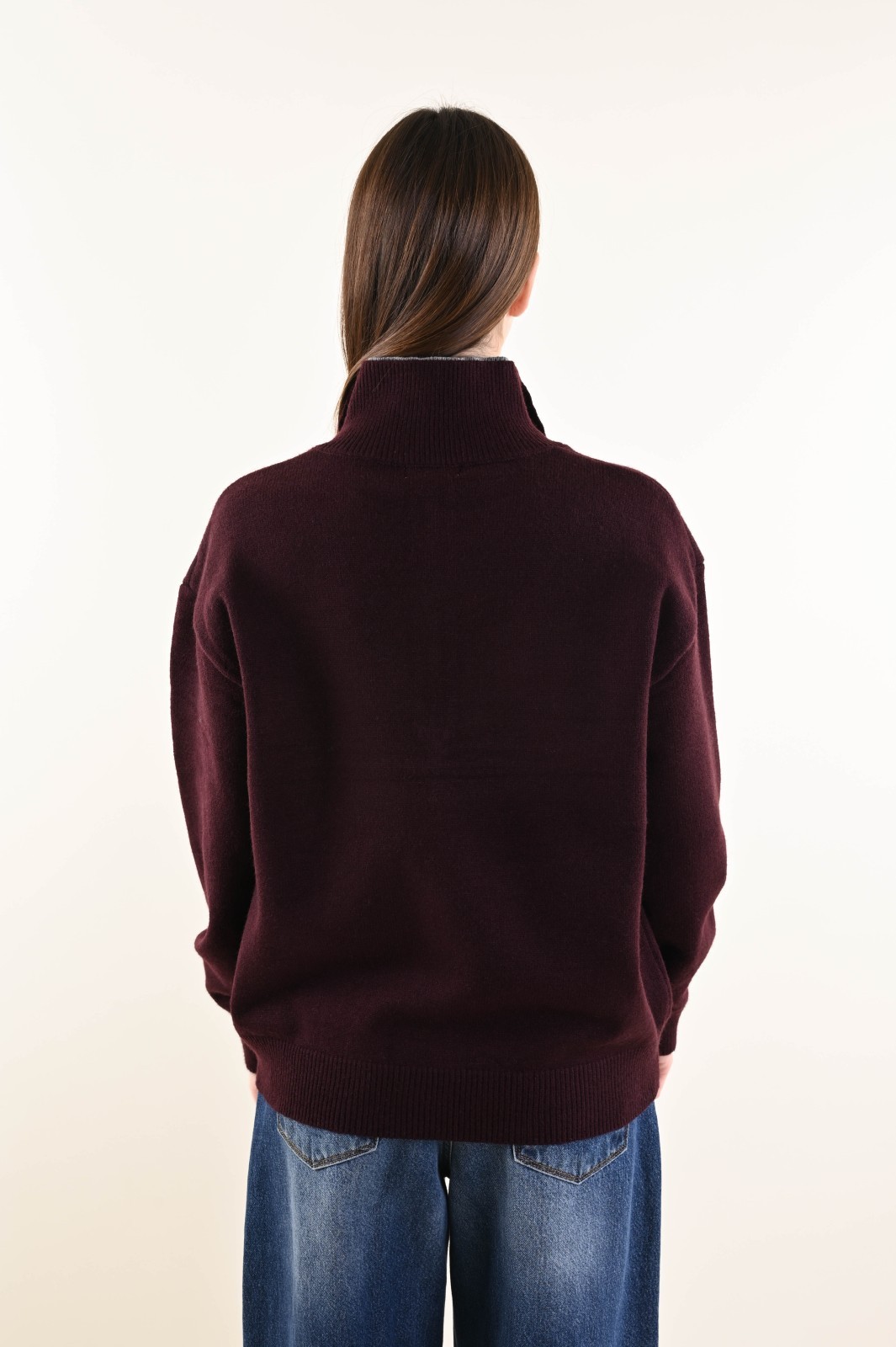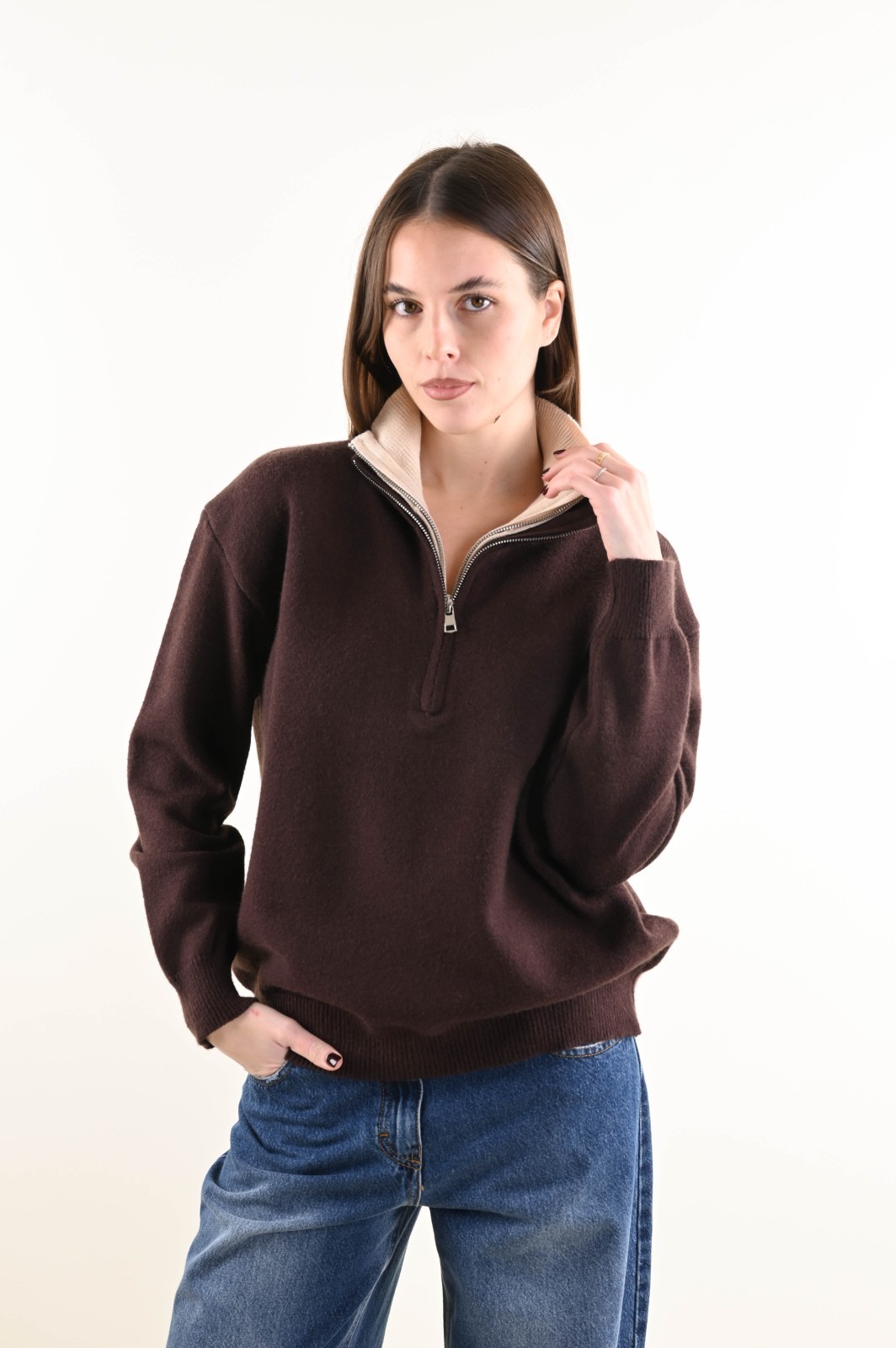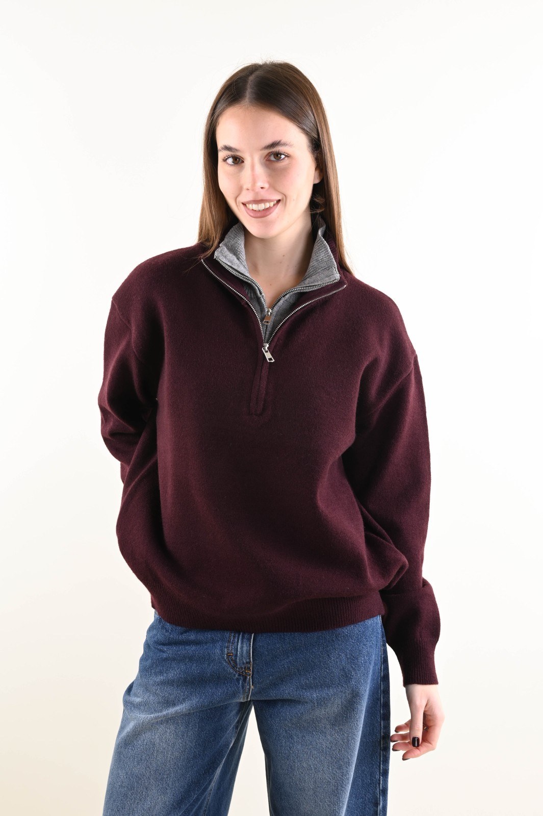 Maglia donna con zip e collo alto a doppio strato, un modello casual e raffinato ideale per boutique che cercano capi pratici, caldi e versatili.