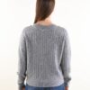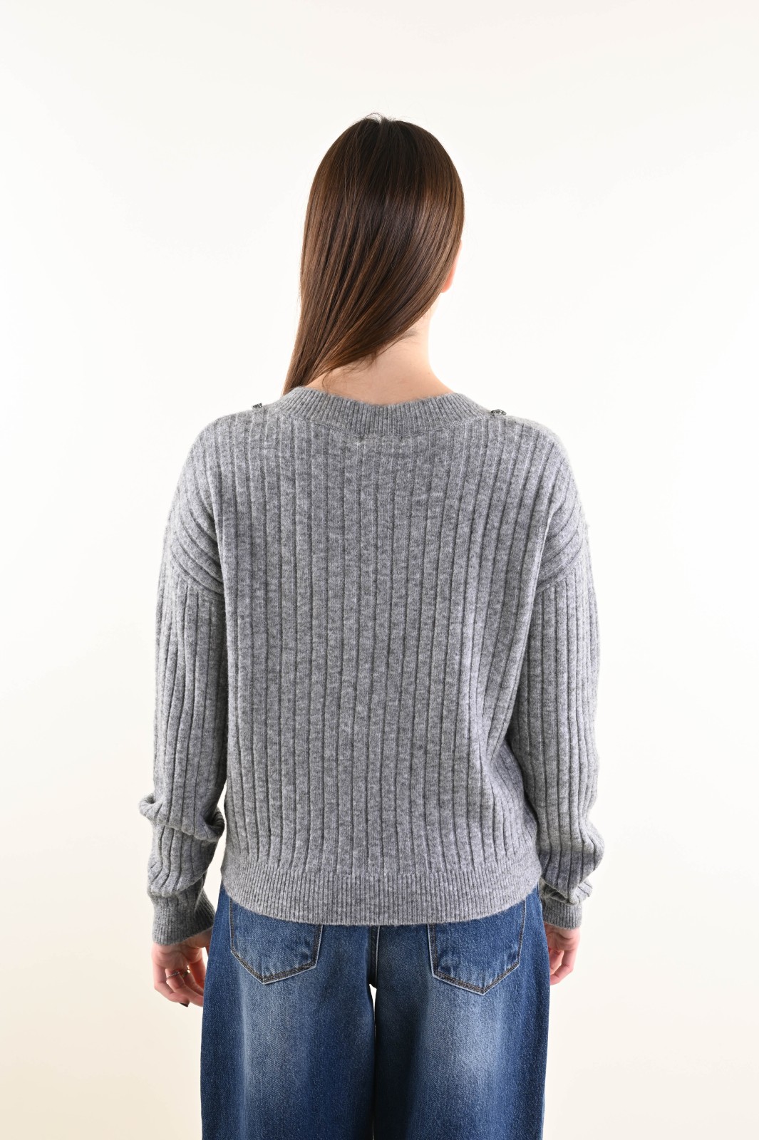 Maglia a coste dalla linea morbida con scollo a V valorizzato da un elegante dettaglio gioiello. Il modello presenta finiture a costine su polsi e fondo, per una vestibilità comoda e femminile. Un capo versatile che unisce comfort e ricercatezza, ideale per completare look quotidiani e outfit più raffinati.