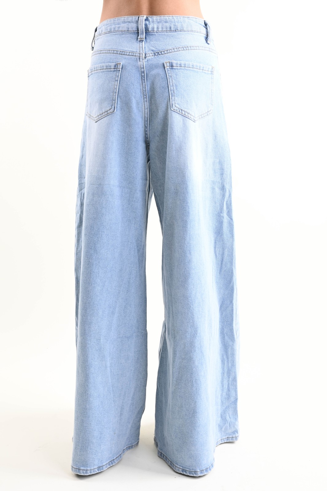 Jeans donna a gamba ampia, modello wide-leg, vita alta e chiusura regolare con bottone e zip. Modello cinque tasche e lavaggio chiaro e uniforme che dona un aspetto pulito e contemporaneo.