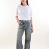 Jeans donna dal design deciso e contemporaneo, caratterizzato da vita alta e chiusura frontale incrociata che dona personalità al capo. La gamba dritta con linea ampia accompagna la silhouette con comfort e stile, creando un equilibrio tra carattere e vestibilità.