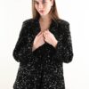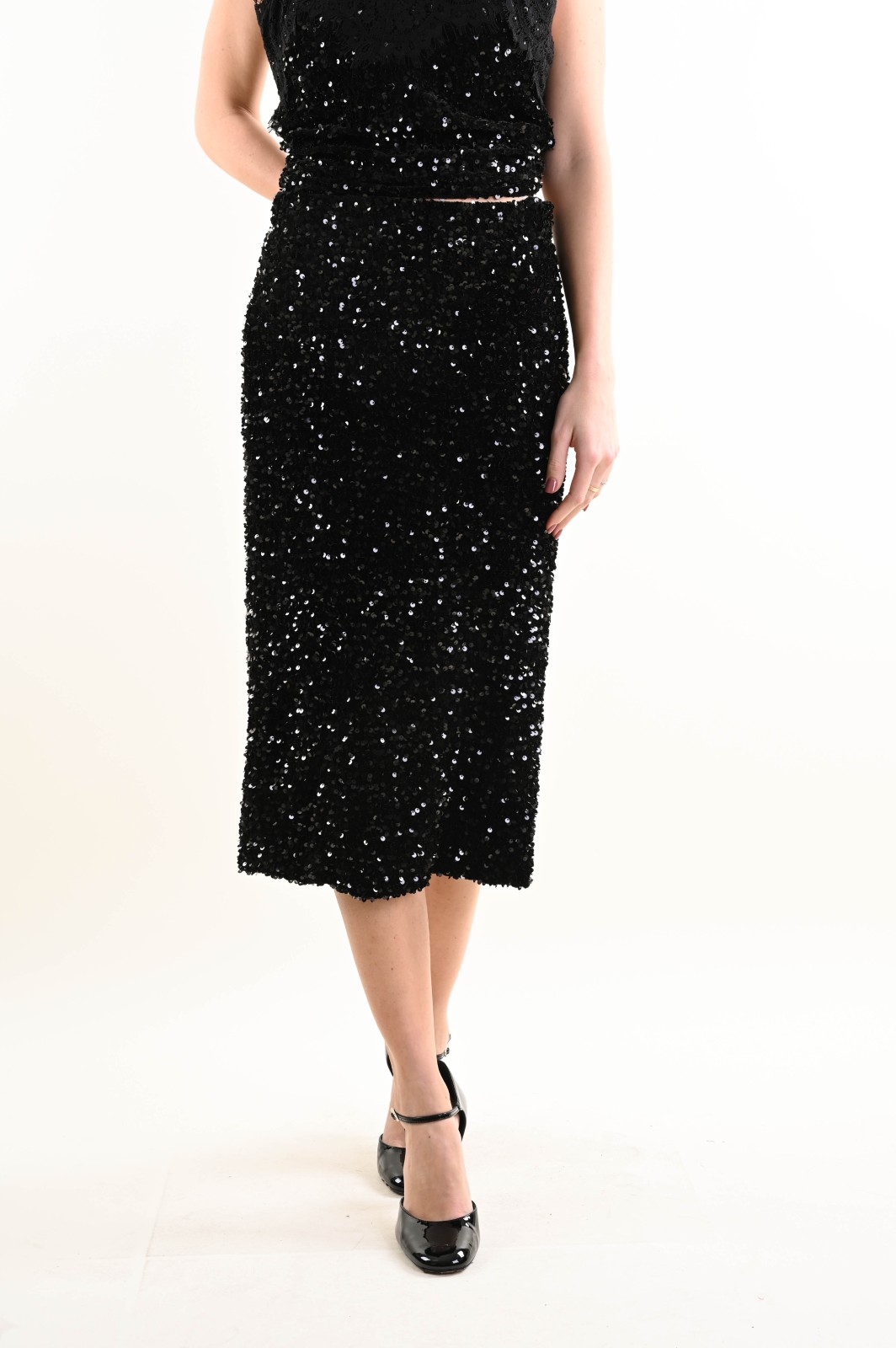 Gonna midi interamente ricoperta di paillettes con base in velluto, dal taglio dritto e femminile. Un capo scintillante e raffinato, ideale per look da sera o occasioni speciali. La lunghezza midi dona equilibrio ed eleganza, rendendo questa gonna con paillettes perfetta da abbinare a top minimal o camicie per un outfit moderno e luminoso.