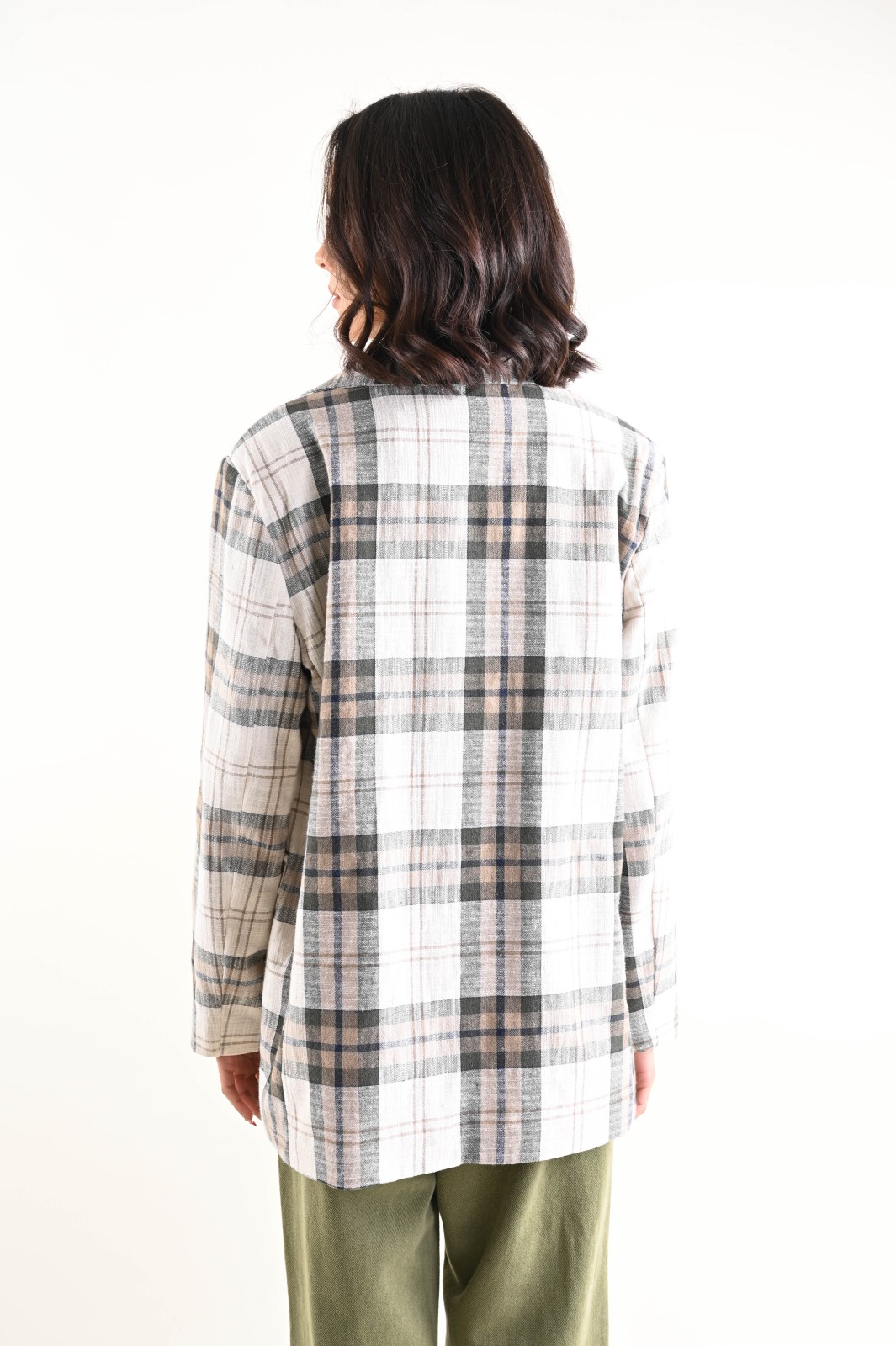Giacca corta in tessuto leggero a quadri, caratterizzata da una linea morbida e moderna. Il modello presenta rever classico, chiusura frontale con bottone e tasche applicate che ne definiscono lo stile casual-elegante. Il dettaglio gioiello sul petto aggiunge un accento femminile e raffinato. La vestibilità è confortevole, pensata per essere indossata sia in completo che come capo spezzato, ideale per un utilizzo quotidiano ma curato.