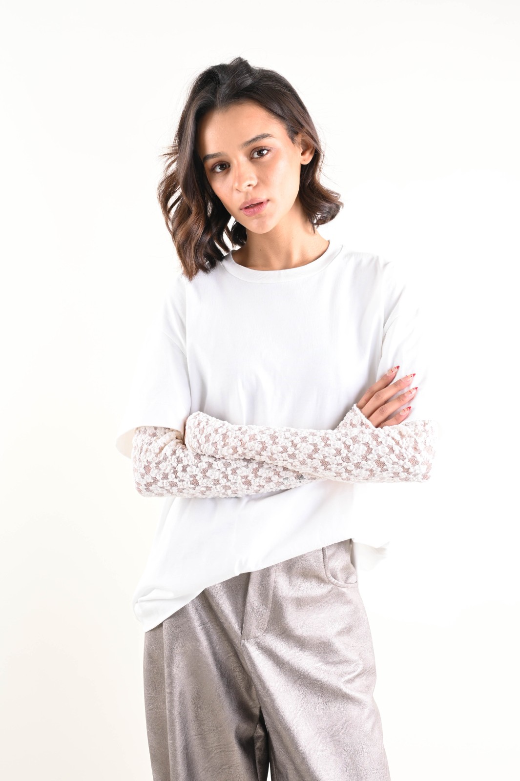 T-shirt donna con maniche in pizzo, girocollo classico. Le maniche corte doppiate con maniche lunghe in pizzo creano un raffinato effetto layering.