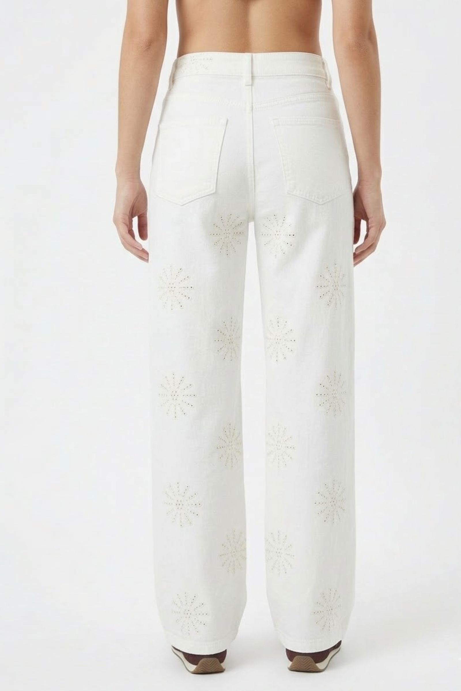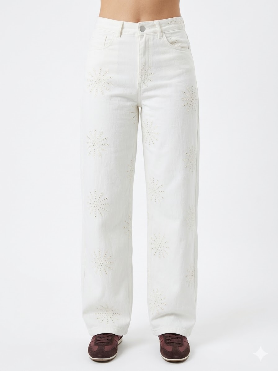 Jeans donna dal design originale arricchiti da ricami traforati che creano un elegante motivo decorativo. Il taglio contemporaneo e la vestibilità confortevole li rendono perfetti per look casual ricercati e femminili. Ideali da abbinare a t-shirt, camicie o maglie leggere per outfit versatili dal carattere distintivo.