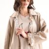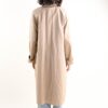 La fodera interna decorata, visibile nei risvolti delle maniche e lungo l’apertura frontale, aggiunge un dettaglio distintivo e valorizza il capo. Le maniche lunghe con possibilità di risvolto permettono di personalizzare lo styling. Un capospalla versatile e curato nei dettagli, pensato per boutique B2B alla ricerca di trench pratici, riconoscibili e ad alto appeal commerciale.