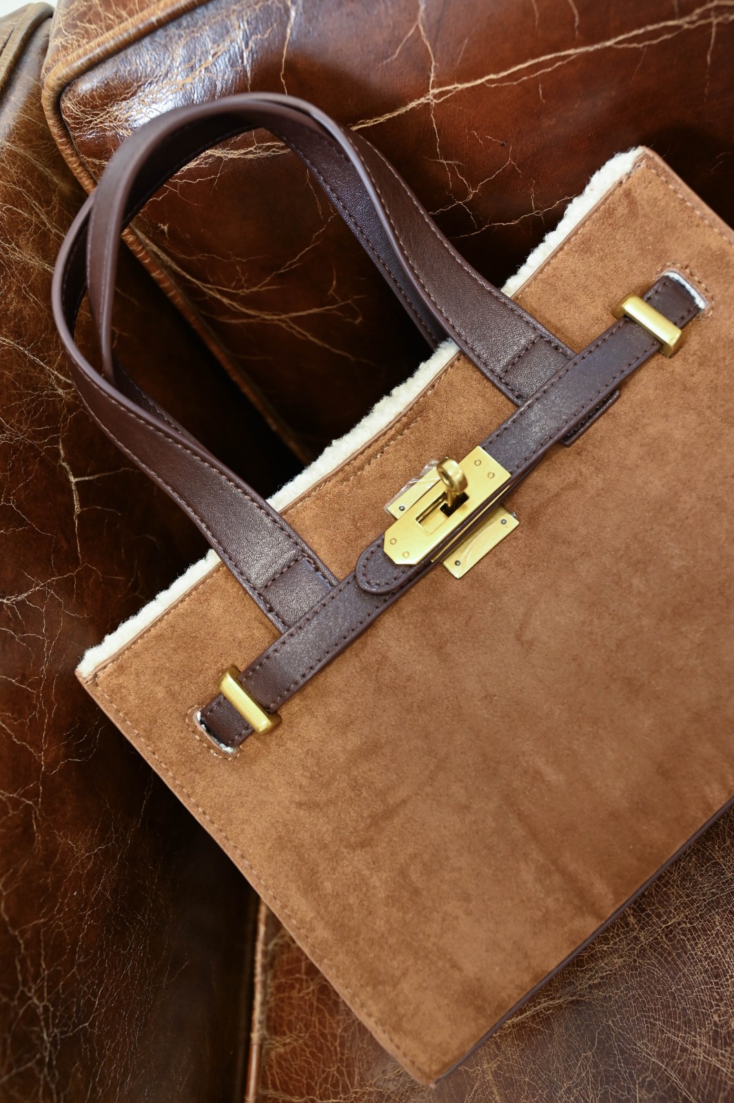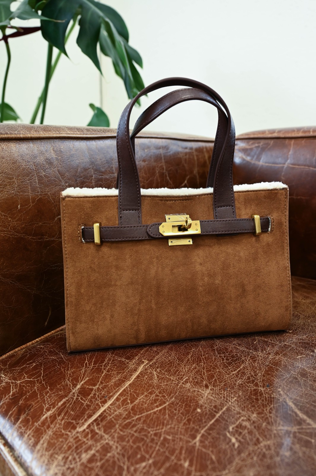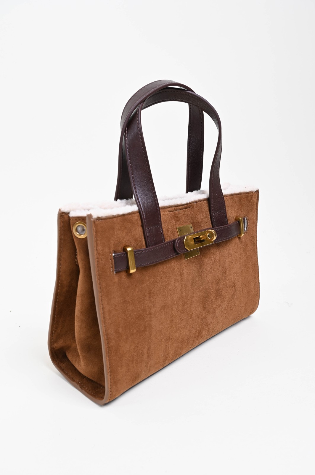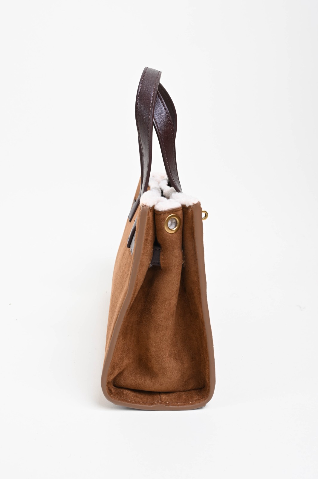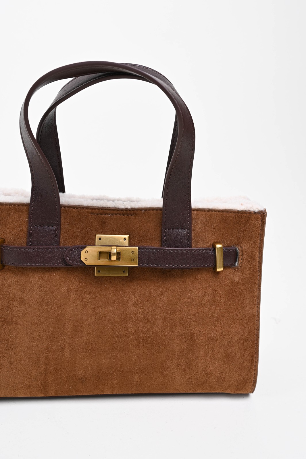 Raffinata e funzionale, questa borsa in ecopelle scamosciata con interno in pelliccia effetto shearling è un accessorio must-have per la stagione fredda. Il design strutturato con manici in ecopelle liscia e chiusura metallica dorata unisce eleganza e praticità.