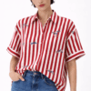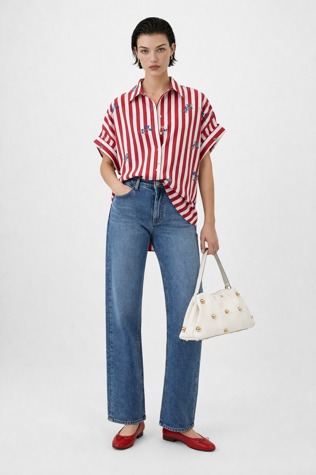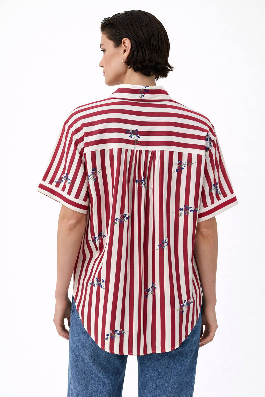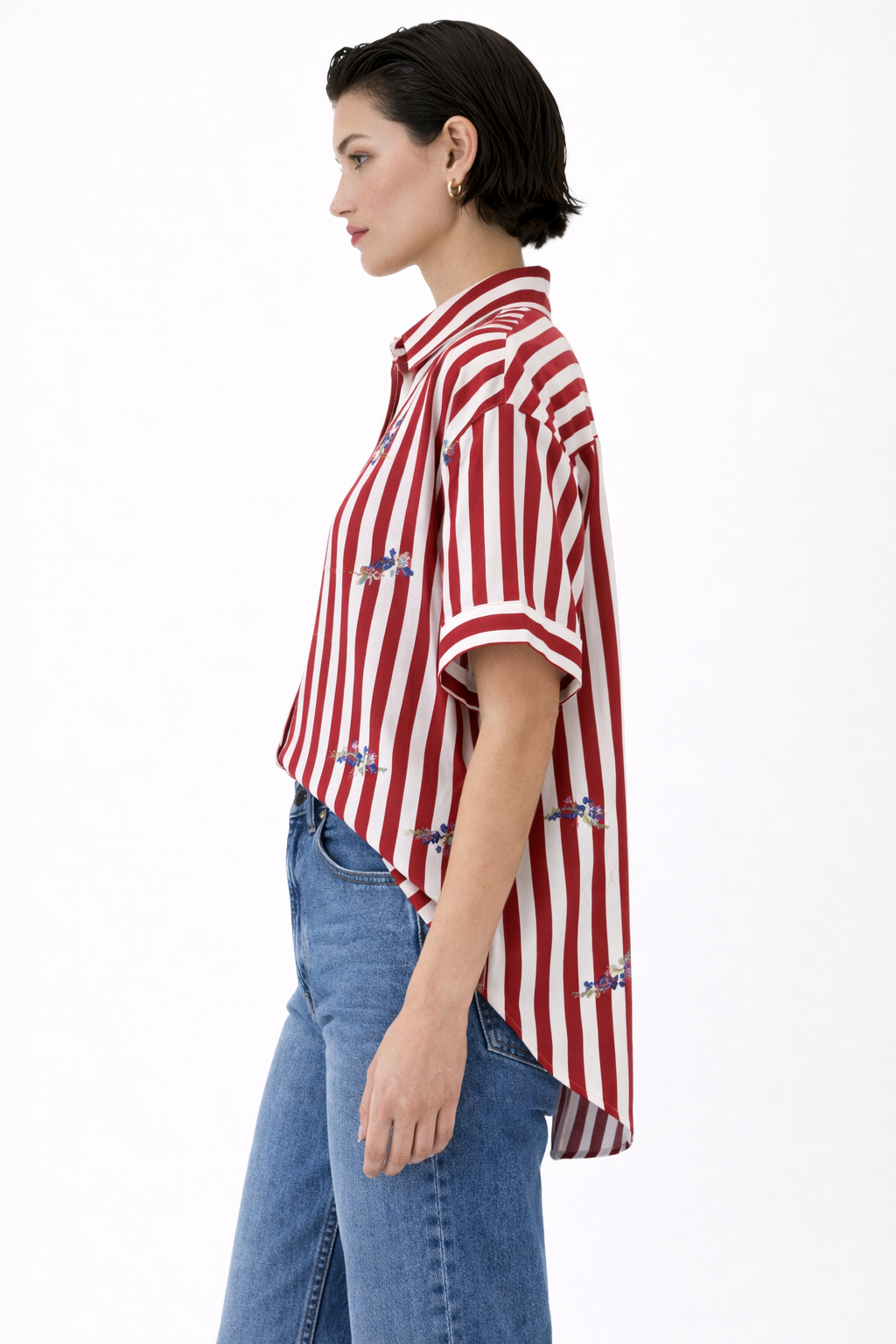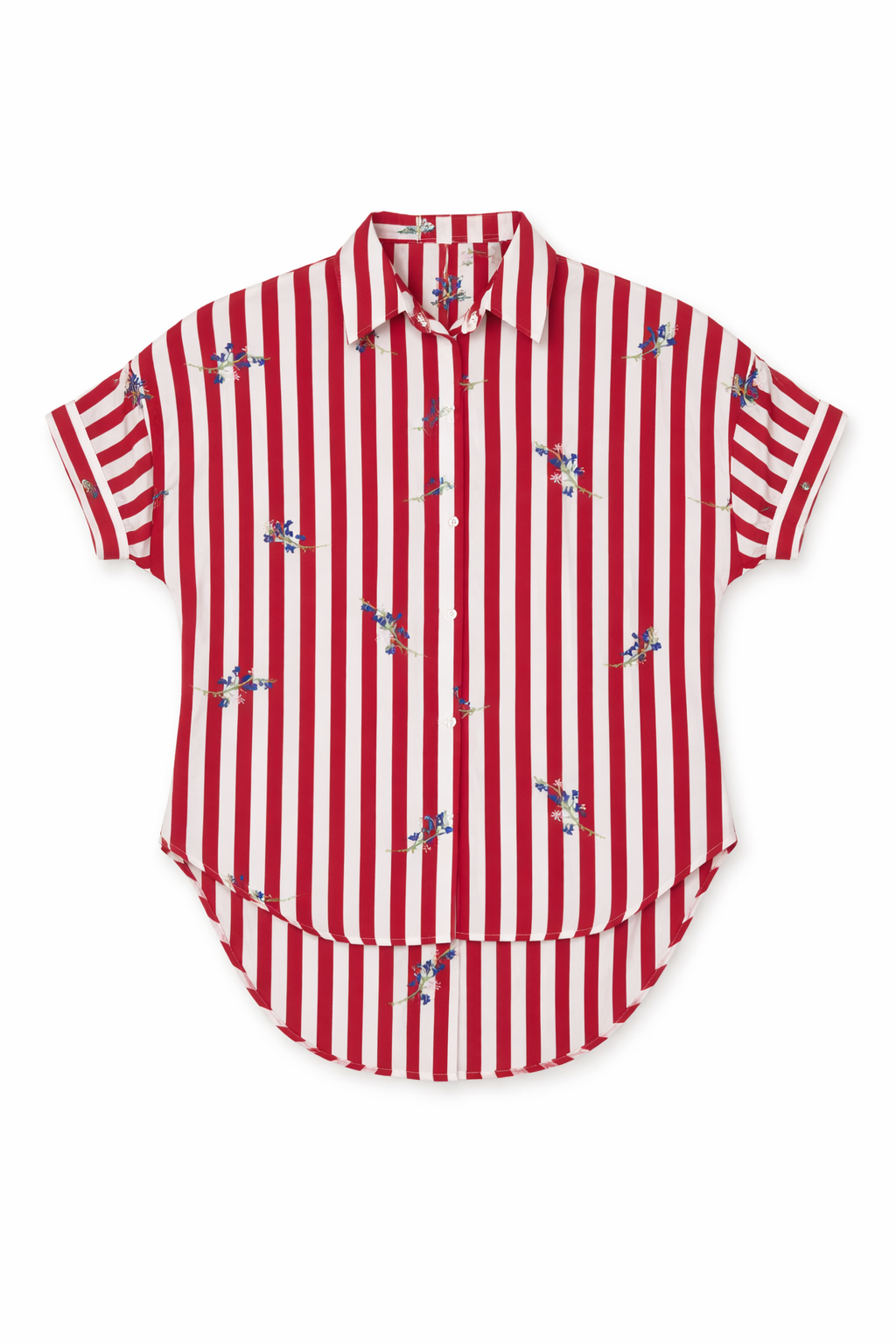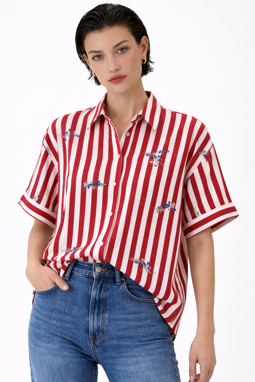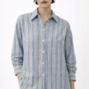 Camicia a righe con ricami floreali, fresca e femminile, perfetta per la stagione estiva. Realizzata in tessuto leggero e confortevole, offre una vestibilità fluida che valorizza la silhouette con naturalezza.