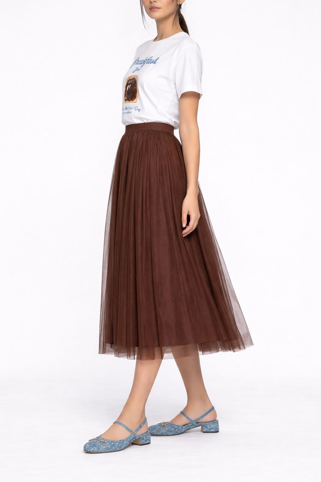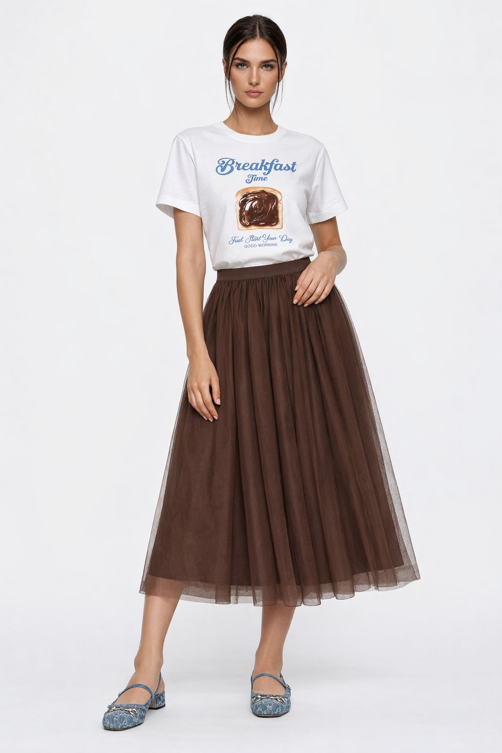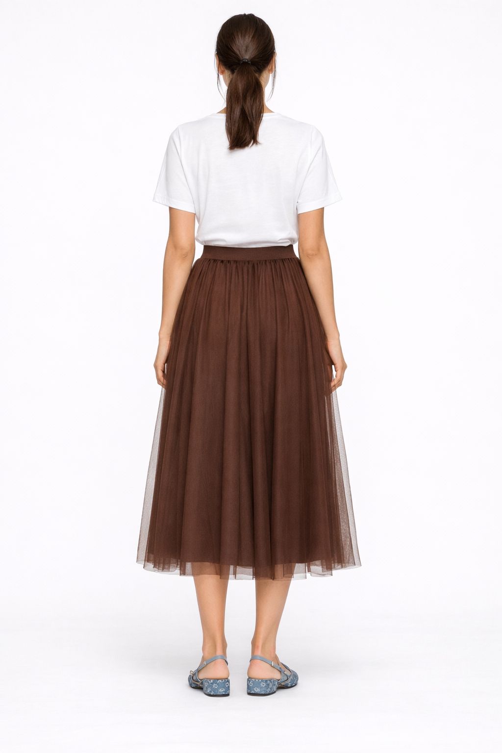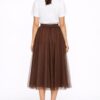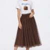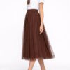 Perfetta per creare outfit dinamici e contemporanei, la gonna lunga in tulle si presta a molteplici abbinamenti: con maglieria per un look quotidiano oppure con top più strutturati per un’immagine più ricercata.