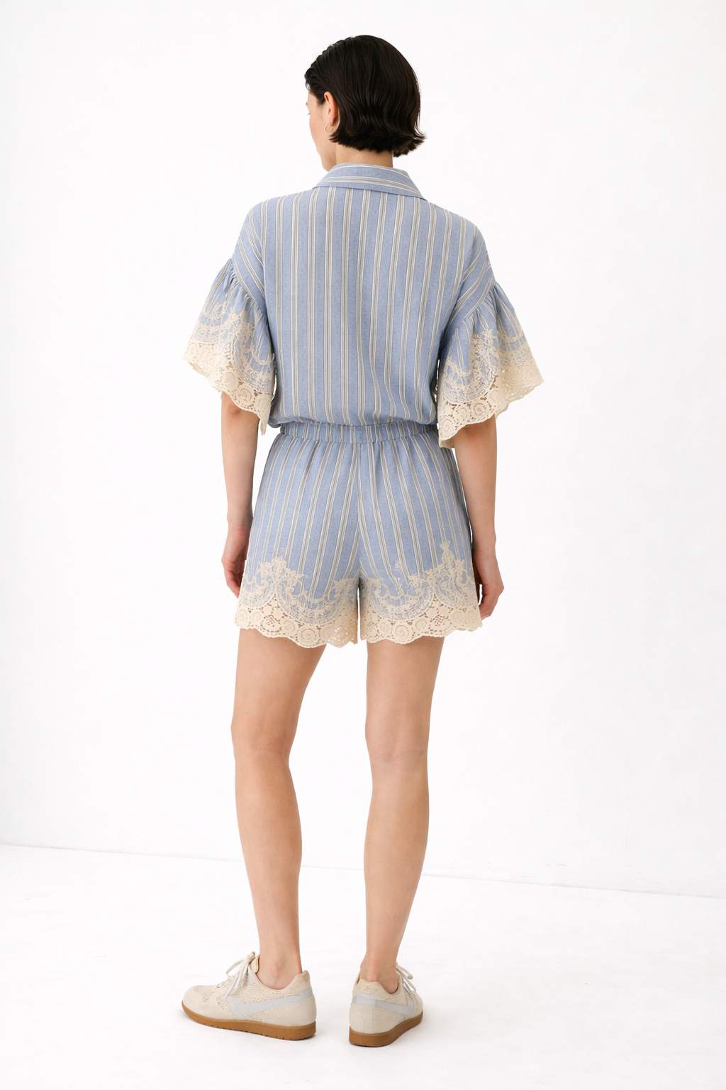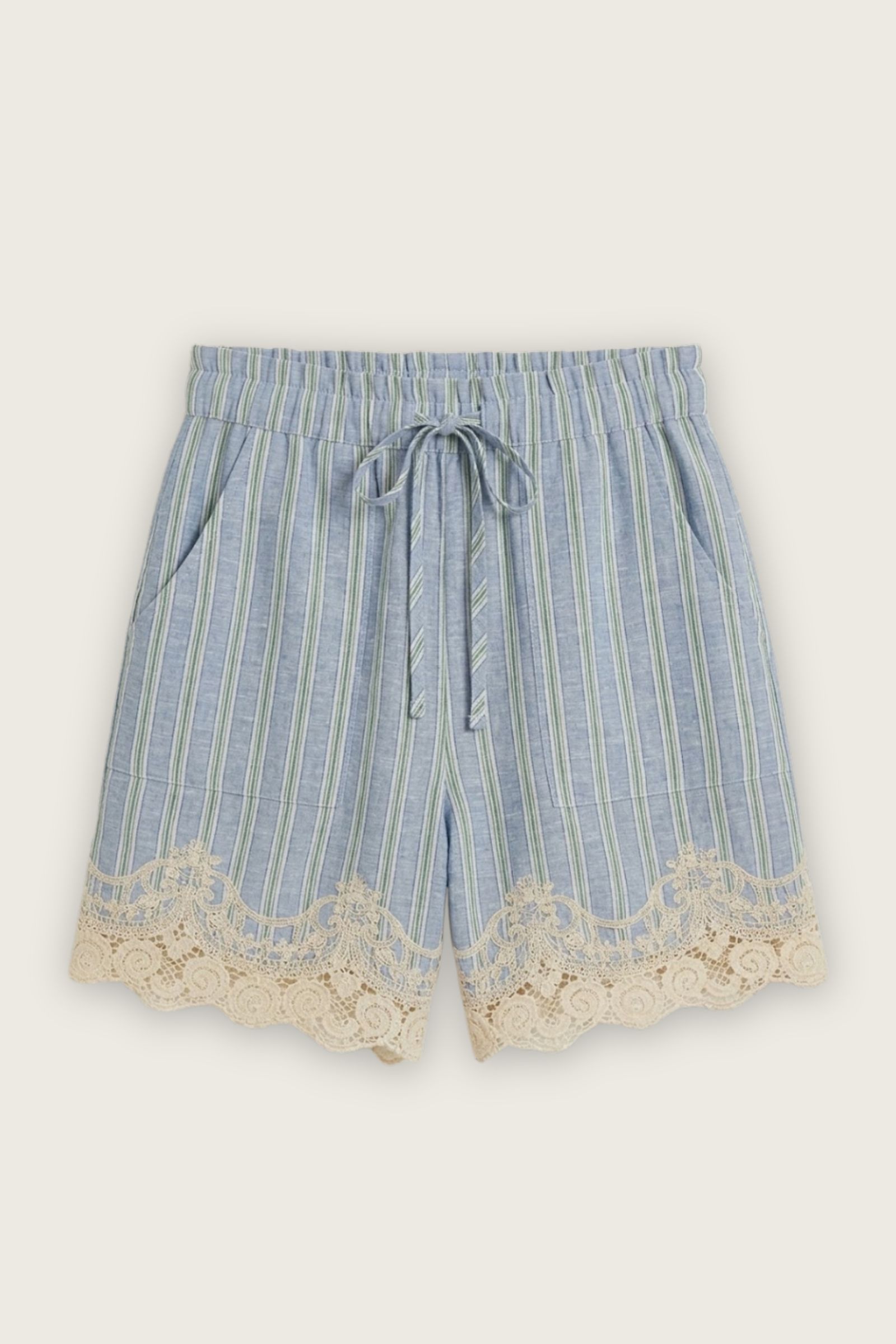 Pantaloncini con inserti in pizzo, femminili e contemporanei, perfetti per la stagione estiva. Realizzati in tessuto leggero e confortevole, offrono una vestibilità piacevole e adatta all’uso quotidiano.