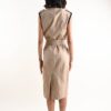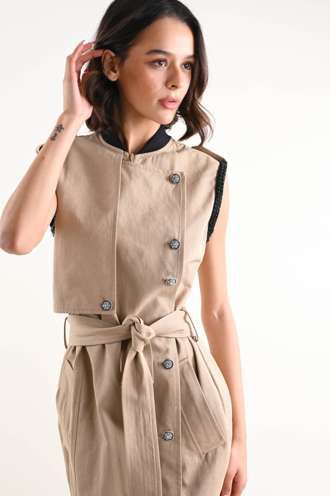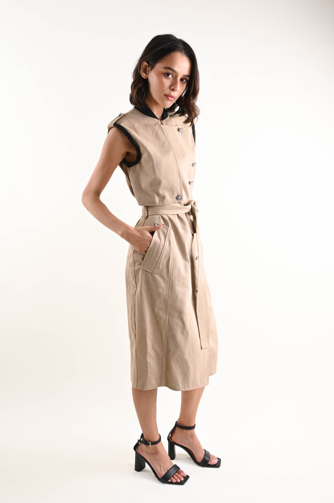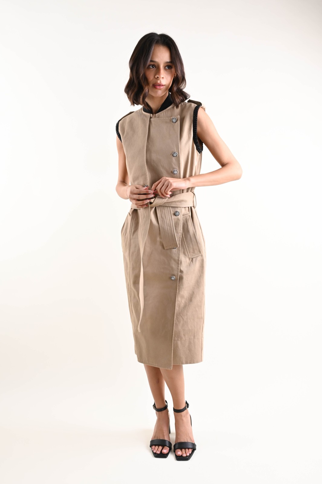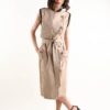 Abito midi smanitcato con bottoni decorativi e fusciacca in vita che permette di regolare la vestibilità, definendo il punto vita e offrendo comfort durante l’utilizzo. Il taglio midi rende l’abito adatto a diverse occasioni, dal look quotidiano a proposte più eleganti e ricercate. I dettagli funzionali, come le tasche, aggiungono praticità senza rinunciare allo stile.