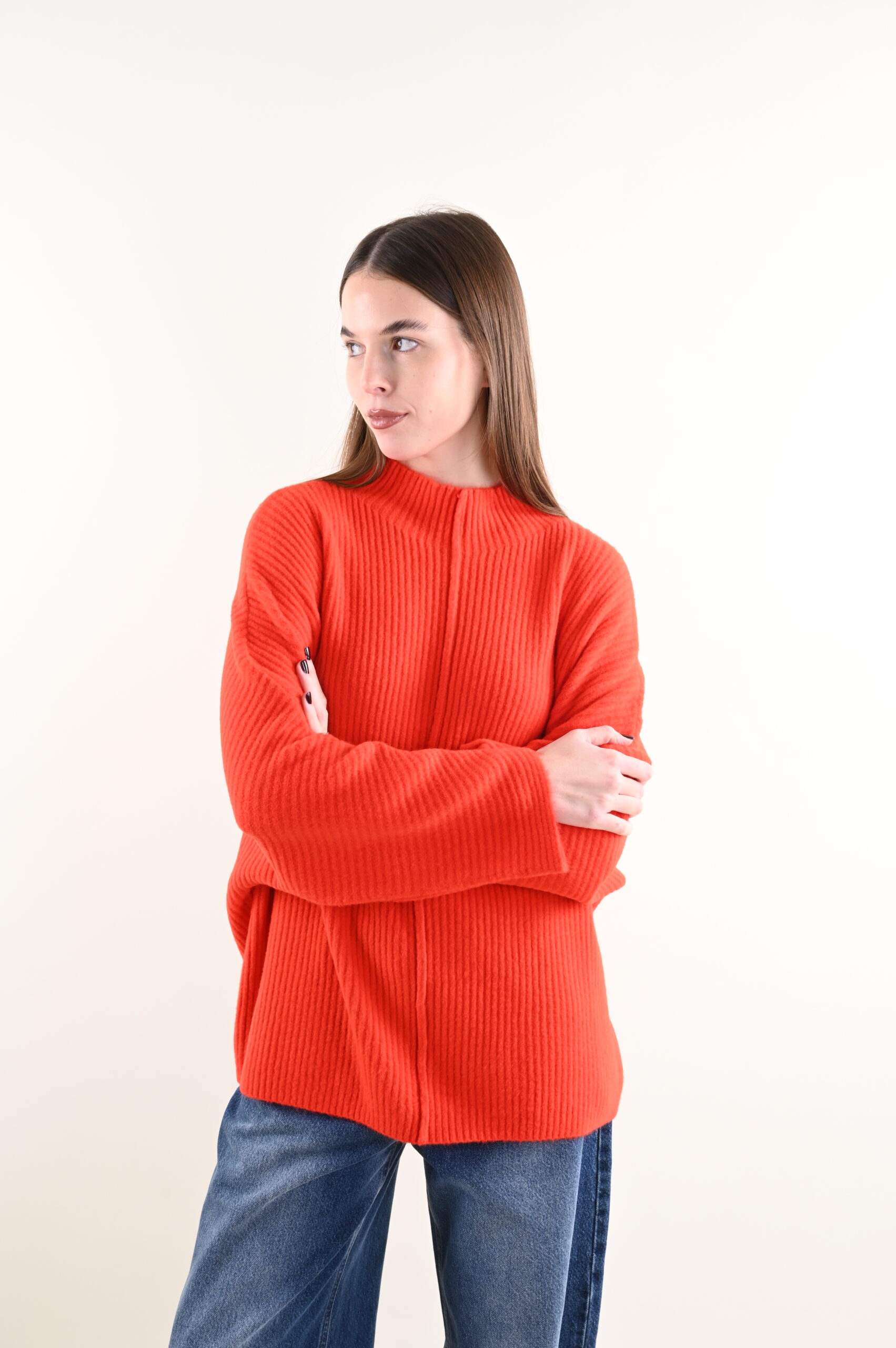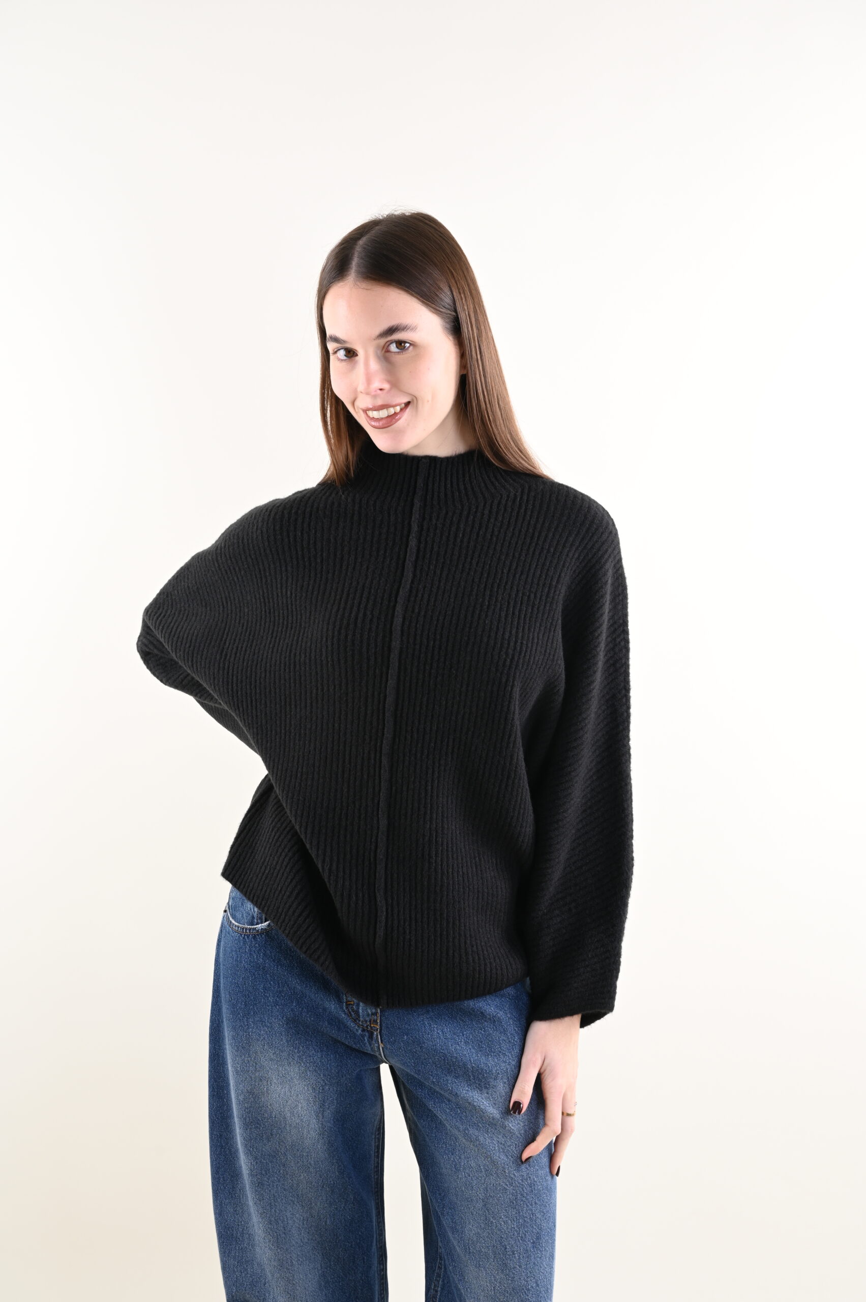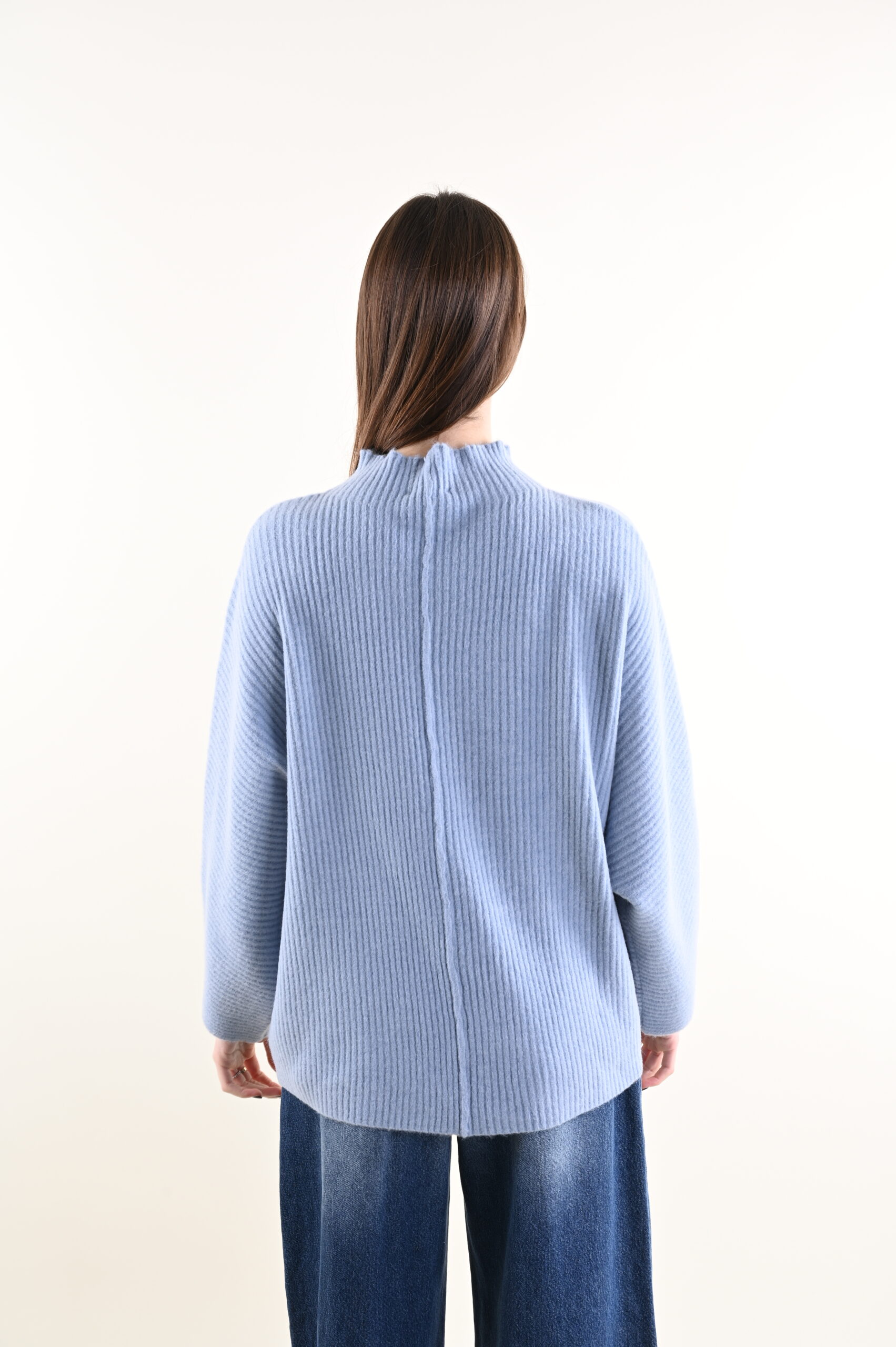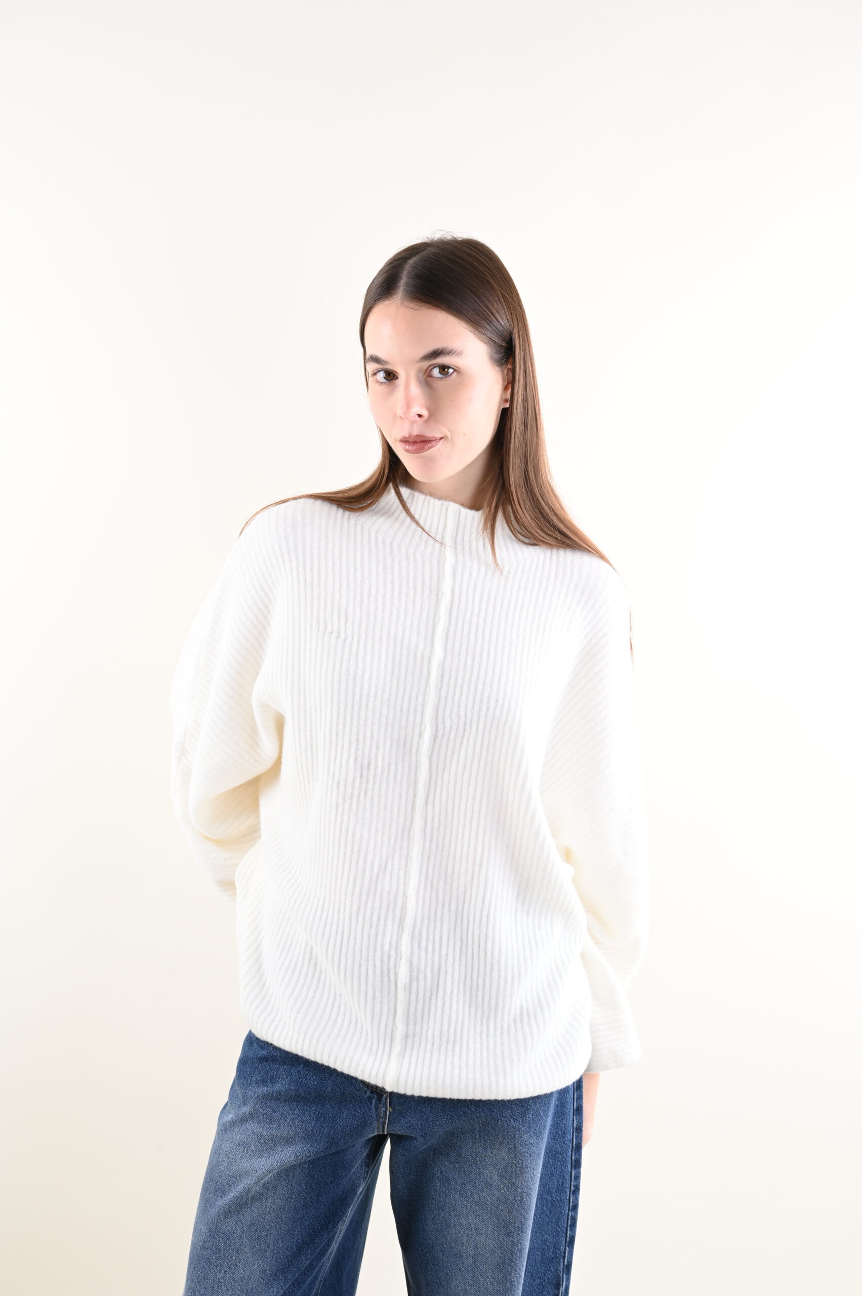 Maglia a coste dalla linea morbida, caratterizzata da un collo alto confortevole e una struttura avvolgente. La cucitura centrale valorizza la silhouette e dona un tocco moderno al design. Le maniche leggermente ampie e il fondo morbido garantiscono una vestibilità comoda e femminile. Un capo essenziale e versatile, perfetto per look quotidiani e layering di stagione.