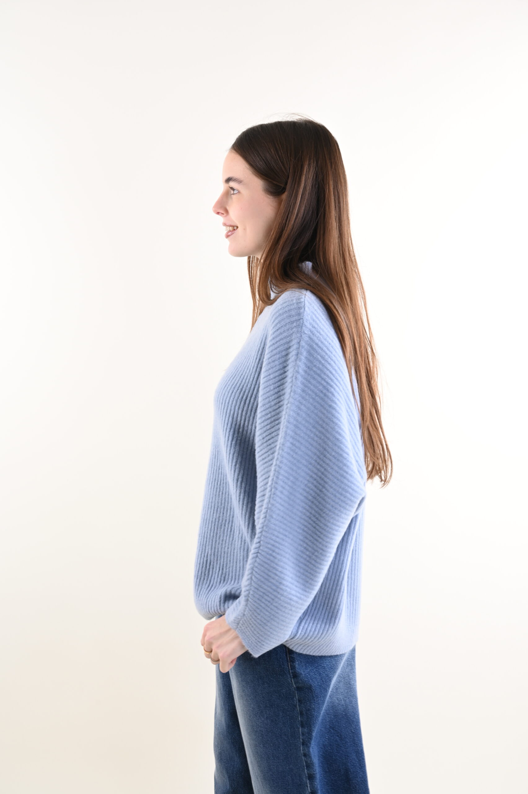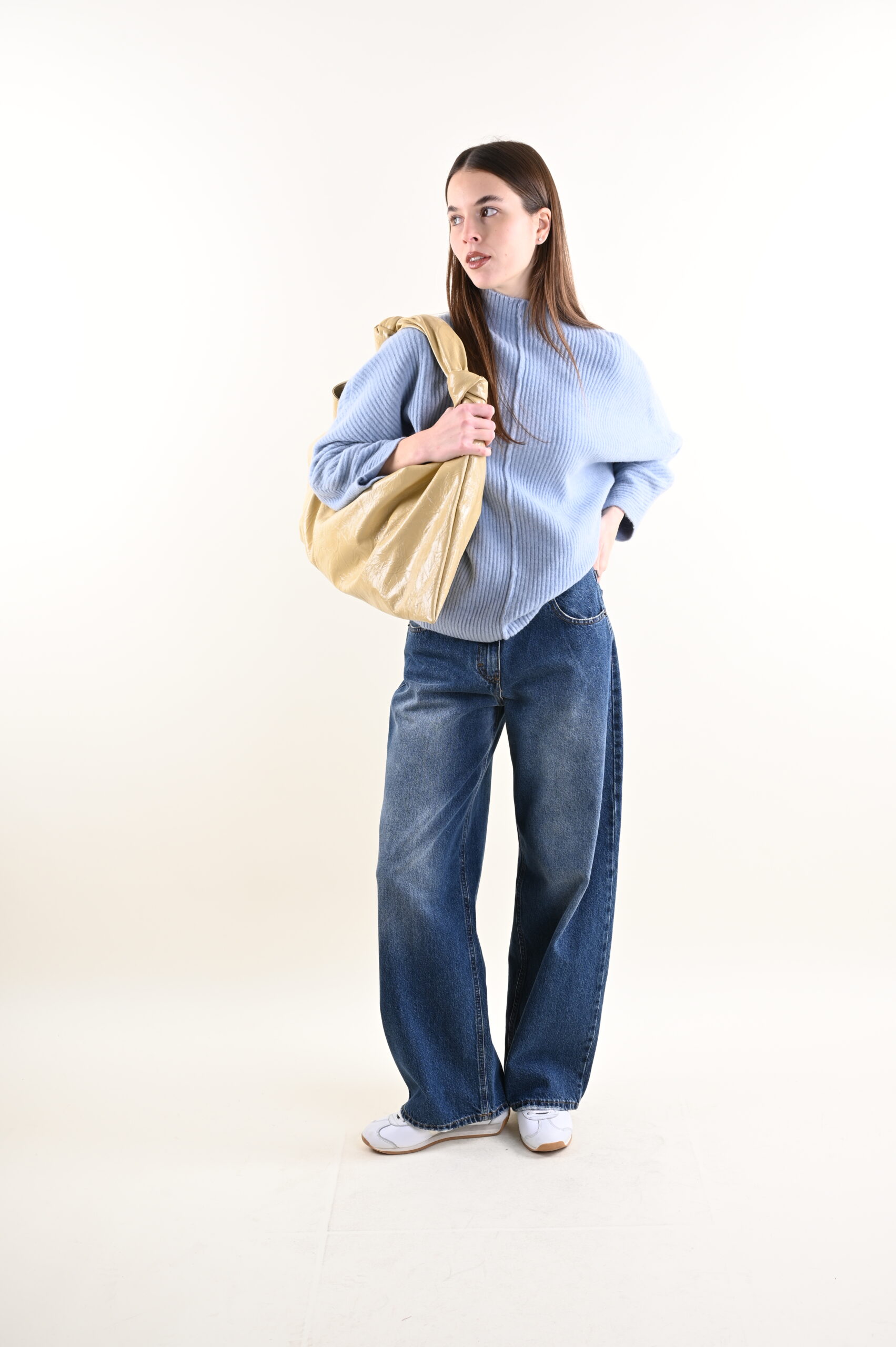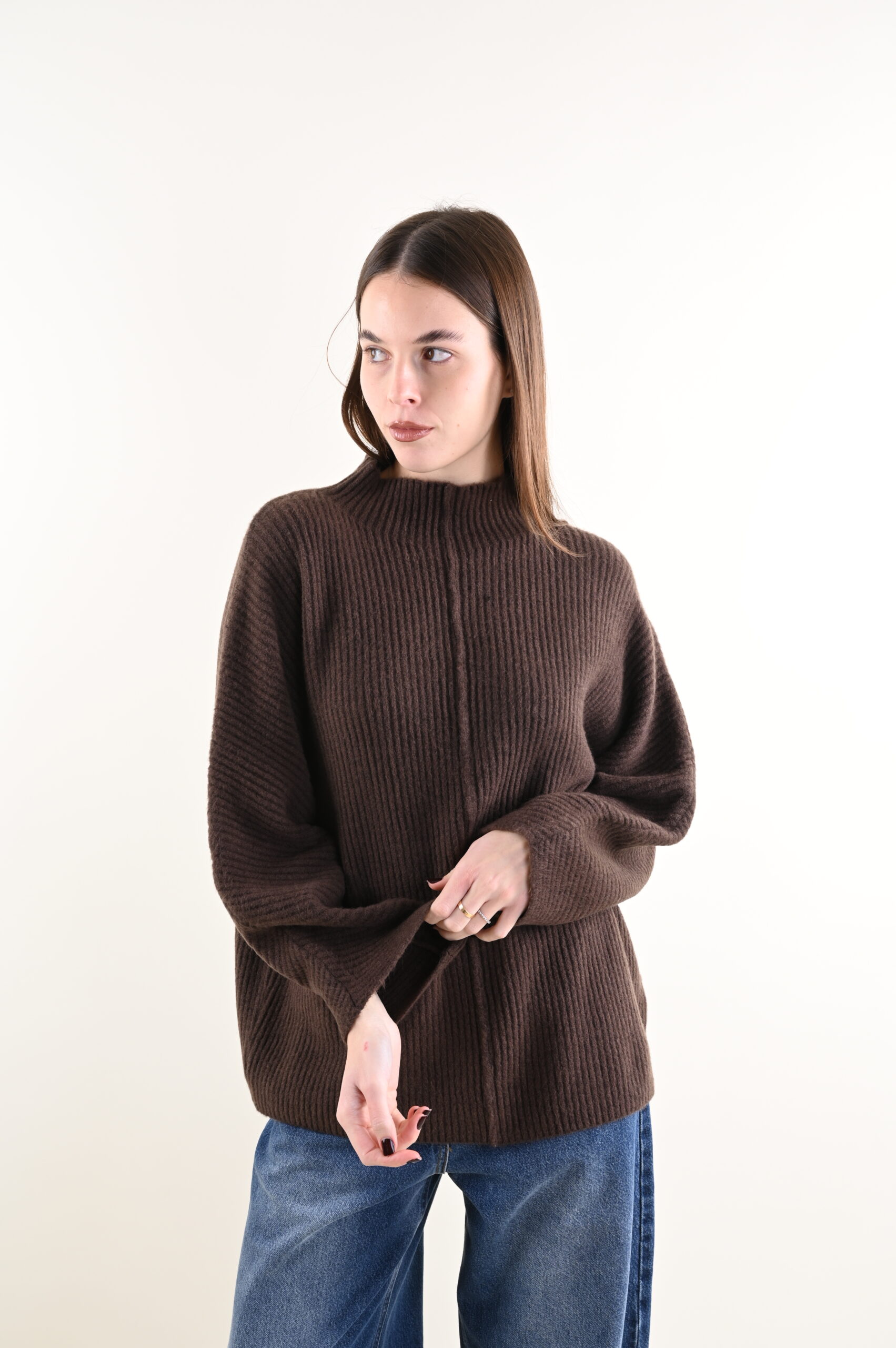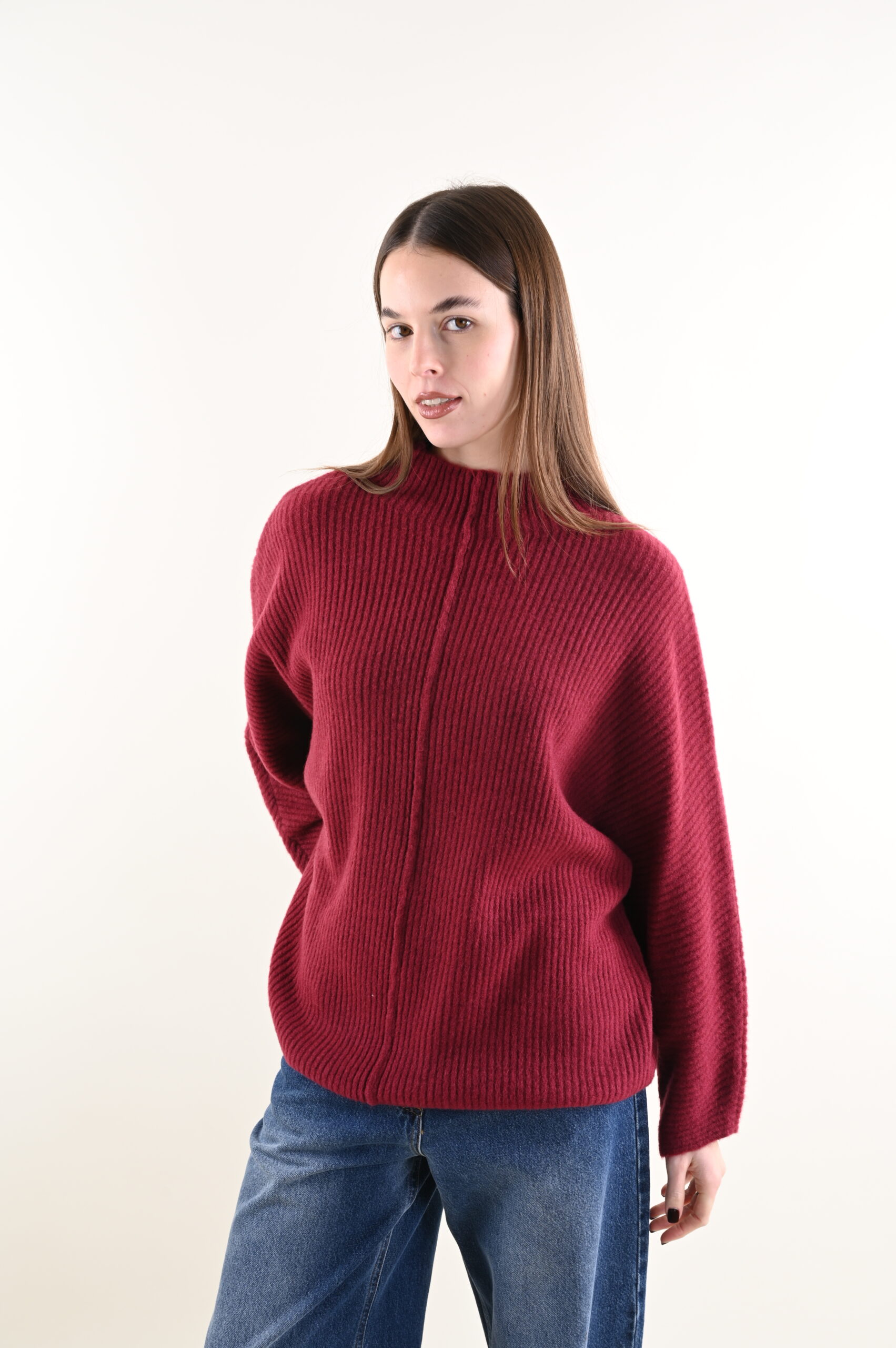 Maglia a coste dalla linea morbida, caratterizzata da un collo alto confortevole e una struttura avvolgente. La cucitura centrale valorizza la silhouette e dona un tocco moderno al design. Le maniche leggermente ampie e il fondo morbido garantiscono una vestibilità comoda e femminile. Un capo essenziale e versatile, perfetto per look quotidiani e layering di stagione.