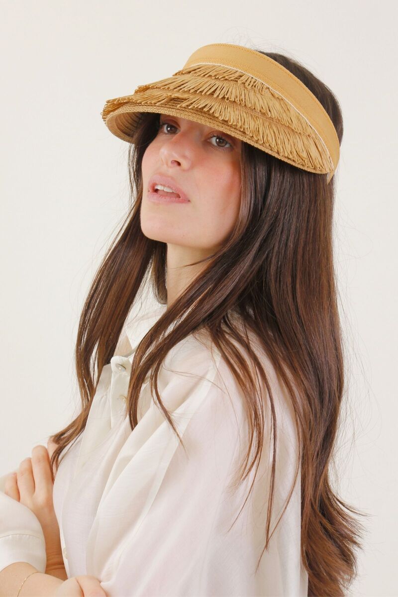 Visiera intrecciata con bordo rigido che garantisce comfort e protezione dal sole e finitura a frange che dona un tocco