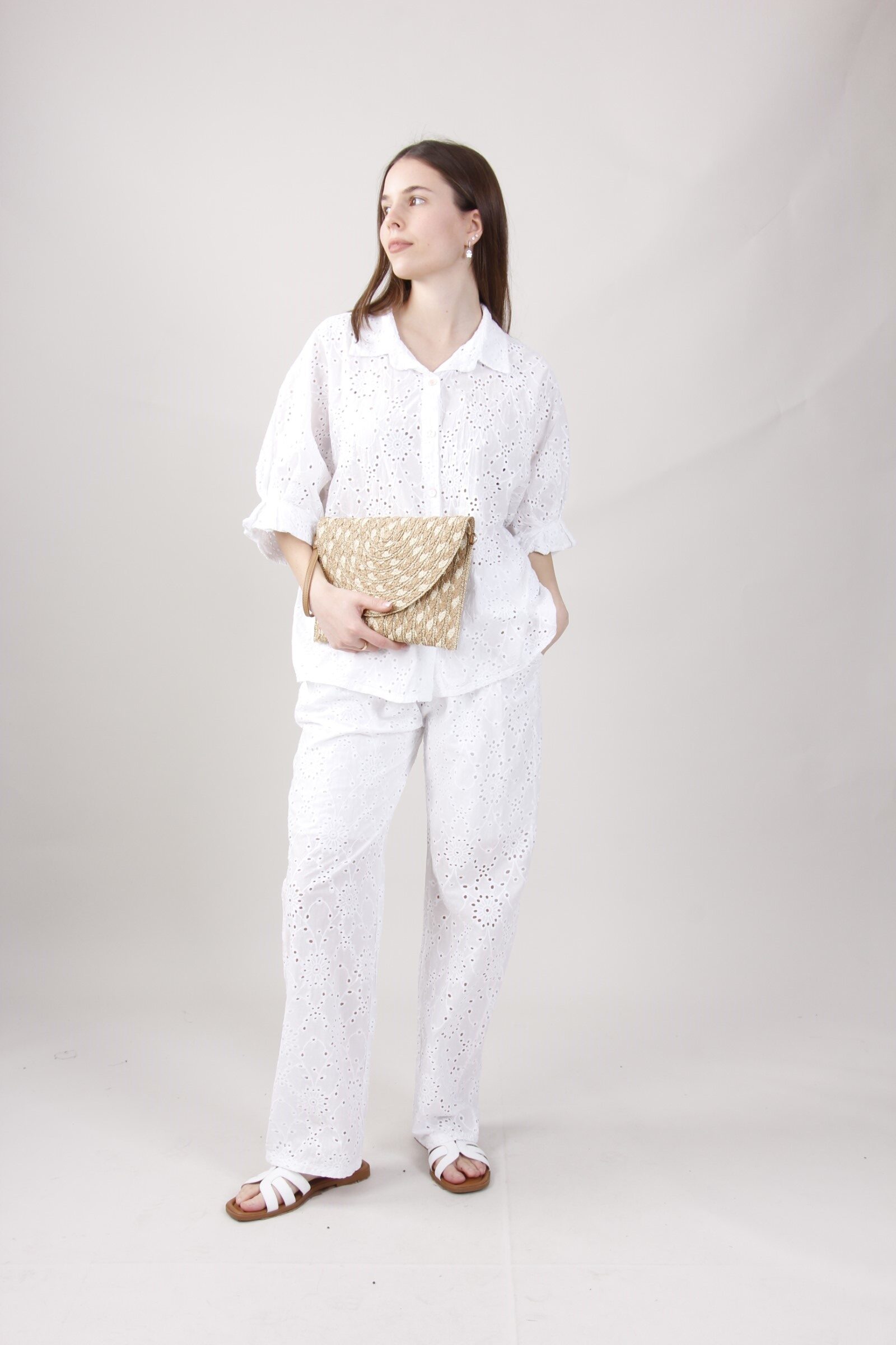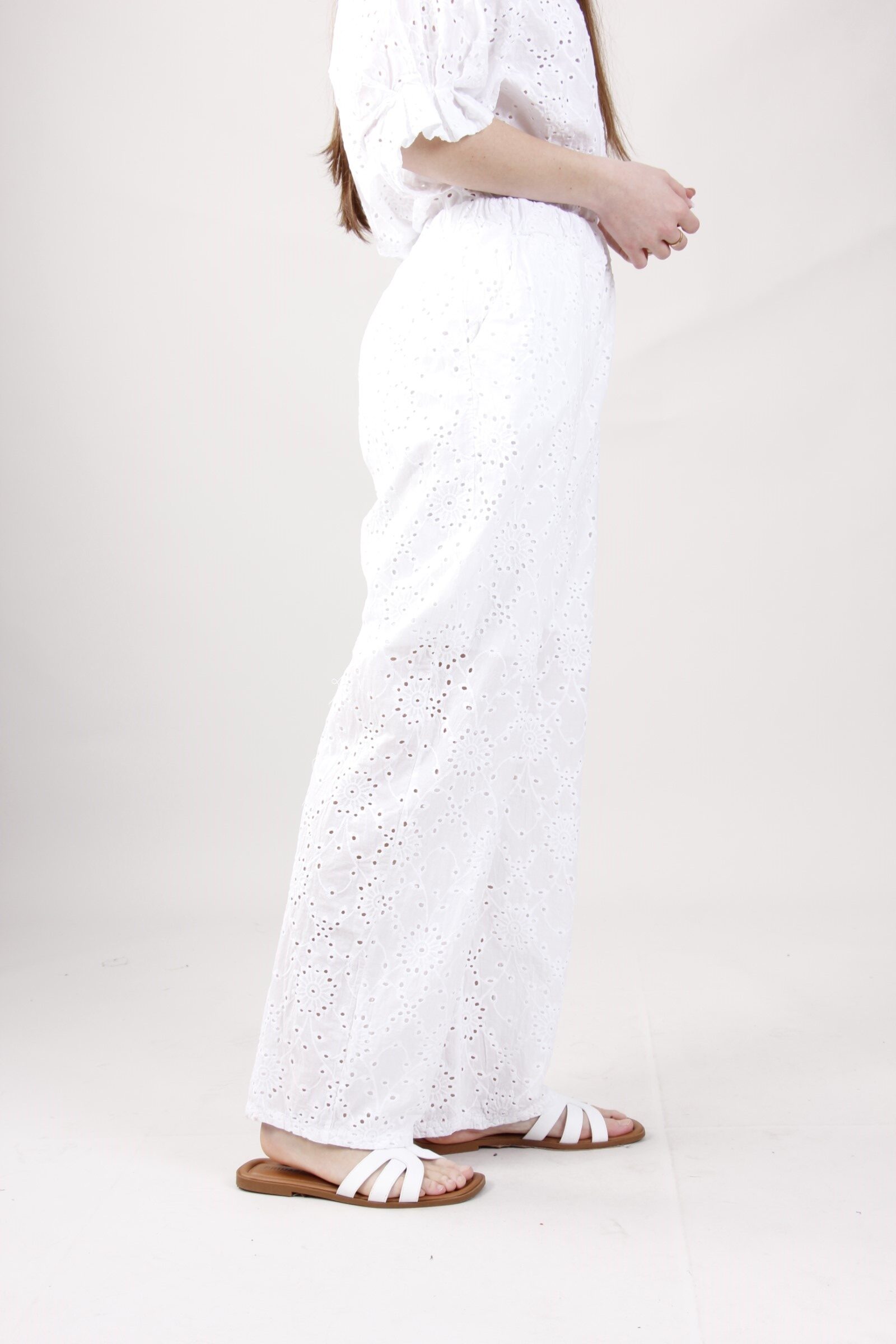 Pantaloni morbidi in pizzo sangallo con elastico in vita.